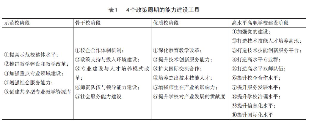政策杠桿的積極效應主要體現為能力建設工具的階次遞進,促進了外部資源對職業教育內涵質量的全方位支持(表1)。