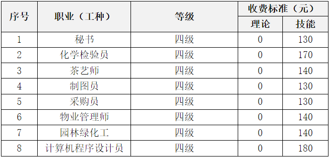 根據(jù)省物價局 省財政廳 省勞動和社會保障廳《江蘇省職業(yè)技能鑒定收費管理辦法》,本次認(rèn)定工種及認(rèn)定收費標(biāo)準(zhǔn)如下: