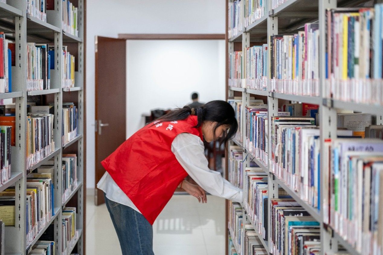 活動現場,志愿者身著統一紅馬甲,認真聆聽館方工作人員講解注意事項后,迅速高效分工:一組專注流通書籍編碼歸位,逐本核對、精準上架,確保每本圖書“對號入座”;一組細致擦拭書架、書桌,不放過縫隙積塵,全力清理衛生死角;同時協力整理報刊雜志架,精心擺放綠植裝飾,讓圖書館角落盡顯整潔溫馨。大家嚴謹務實的工作態度,贏得了館方工作人員的一致好評。志愿者顧婧媛表示:“能親手為讀者打造更舒適的閱讀環境,用志愿力量護持書香,這份責任特別有價值!”