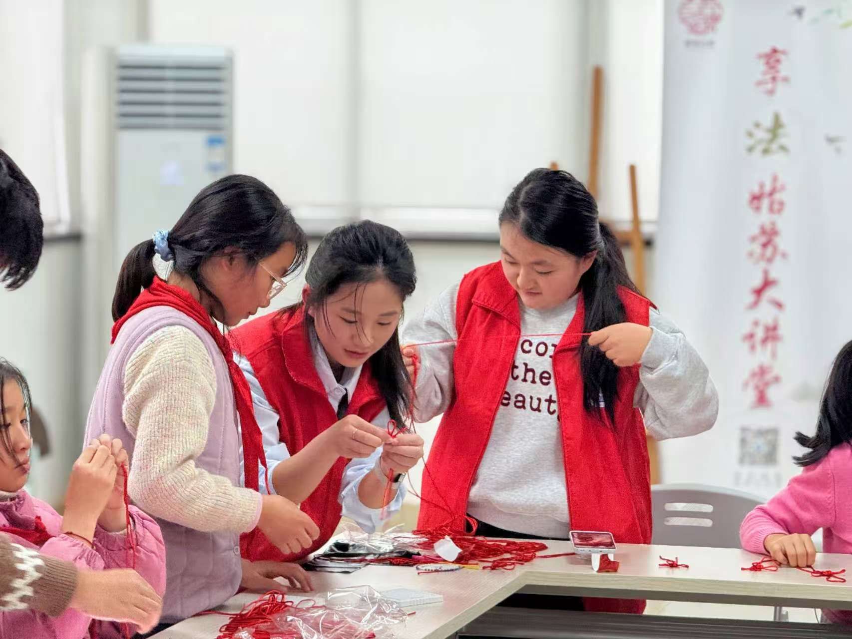 活動現場,志愿者提前備好紅繩、剪刀等材料,為活動開展提供堅實保障。志愿者結合小學生認知特點設計專屬教學流程:講解環節以“紅繩寄愿、平安納福”為核心,用通俗有趣的語言講述中國結的歷史淵源,并通過現場演示,分步拆解平結、金剛結的編織技巧,耐心指導孩子們完成編織操作。活動過程中,孩子們熱情高漲、積極參與,在互相幫助、共同協作中解決編織難題。經過近一小時的實踐創作,一個個飽含祝福的紅繩手繩順利完成。志愿者王馨嬌笑著說:“雖然教孩子們編結要反復講解步驟,但看到他們捧著成品的笑臉,就覺得特別值得。”