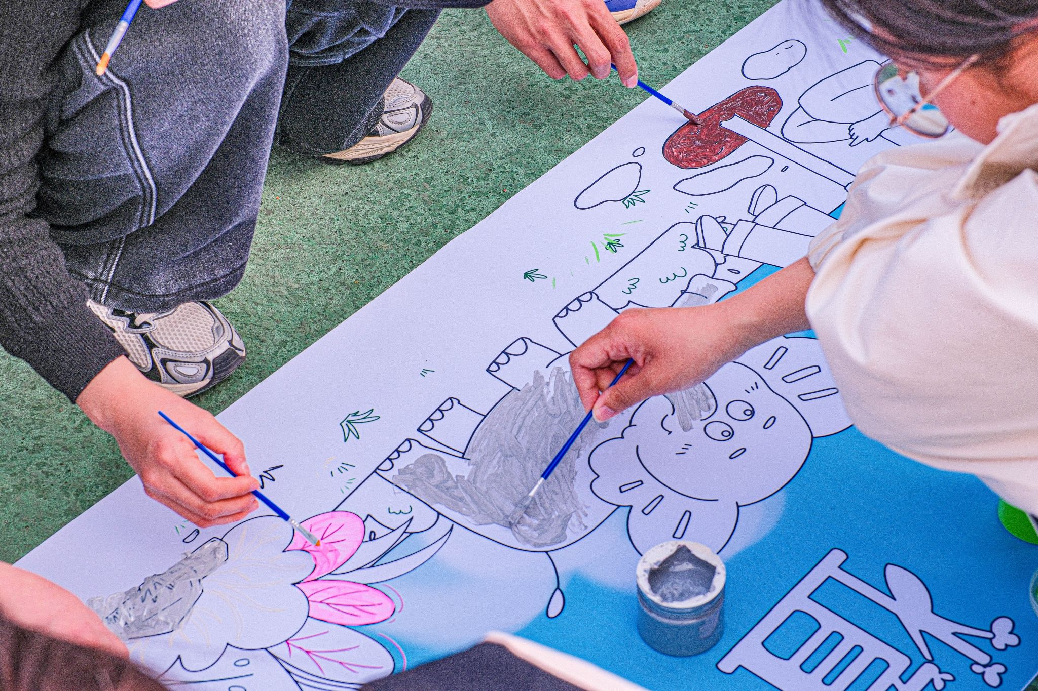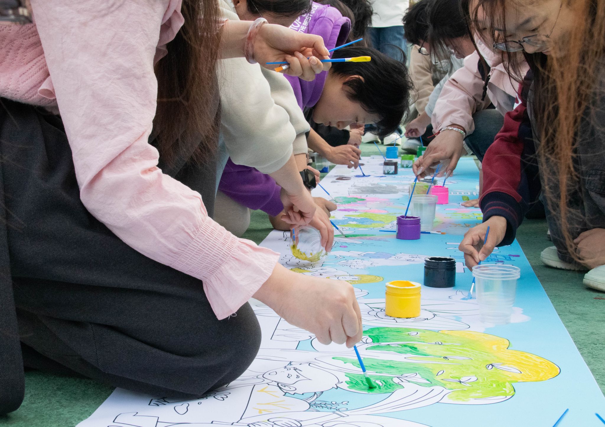 寓教于樂(lè),解鎖綠色新玩法活動(dòng)設(shè)置四大創(chuàng)意關(guān)卡,參與者以團(tuán)隊(duì)形式闖關(guān)集章,贏取植樹榮譽(yù)勛章。“縫7拍手”挑戰(zhàn)中,學(xué)生們圍成同心圓,在快速報(bào)數(shù)中避開"7"的倍數(shù),以拍手傳遞默契,數(shù)學(xué)思維與環(huán)保知識(shí)巧妙碰撞;“我比你猜”環(huán)節(jié),隊(duì)員通過(guò)肢體語(yǔ)言演繹“年輪”“光合作用”等生態(tài)詞匯,便利貼上的關(guān)鍵詞化作無(wú)聲的智慧接力;最考驗(yàn)協(xié)作的當(dāng)屬"蒙眼過(guò)河",佩戴眼罩的選手在隊(duì)友指引下跨越“河流”(障礙物),象征人與自然信任共生;壓軸的“納斯卡巨畫”創(chuàng)作將氣氛推向高潮,兩組隊(duì)員手持顏料刷,在五米畫布上共繪森林,斑斕色彩中流淌著對(duì)地球家園的深情告白。
