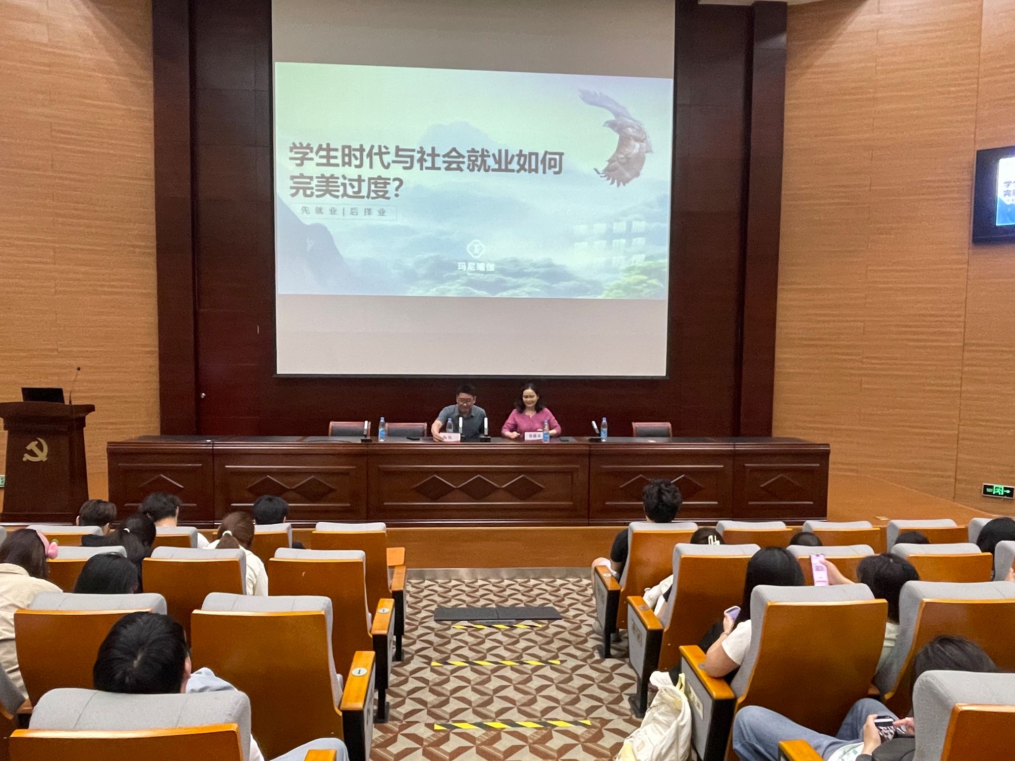 講壇伊始,學院黨總支書記徐建靈代表學院對企業一行的到來表示熱烈歡迎,并向大家詳細介紹了我院與瑪尼瑜伽的校企合作項目進程。隨后,陳懷一董事長就公司概況、企業文化、發展歷程、校企合作、引才需求等方面向在場師生展開了詳細介紹,并就同學們甚為關心的人才培訓、價值實現、薪酬體系、工作環境等方面進行了深度講解。此外,陳懷一先生還結合自身求學與創業經歷,從多個維度為同學們提供了寶貴建議。