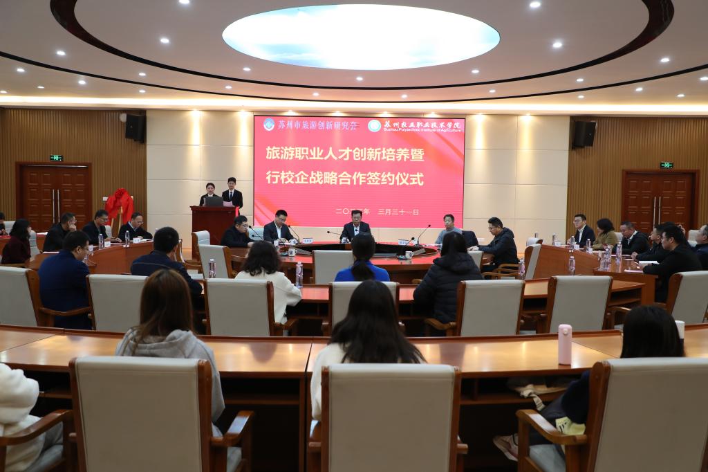 為創新人才培養、促進校企合作、深化產教融合,3月31日上午,旅游職業技能人才創新培養暨行校企簽約儀式在我校課耕樓國際交流中心舉行,蘇州市文旅局市場管理處處長陳金茂,蘇州市旅游創新研究會會長朱毅強,我校副校長周軍、校企合作處處長王鋒、教務處處長劉海明、經濟管理學院副院長馮琳出席了簽約儀式。