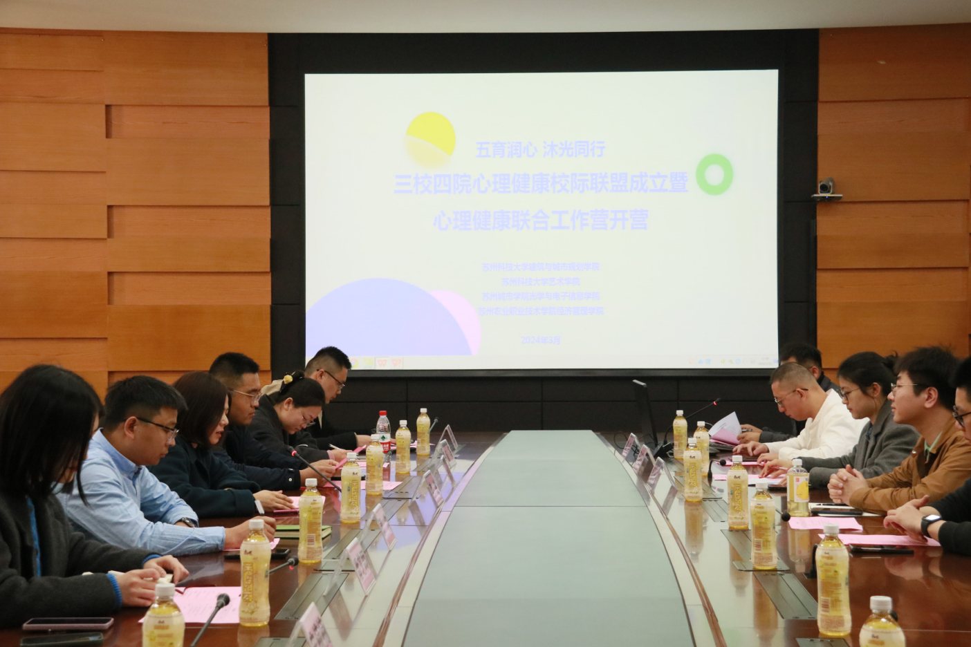 會議由蘇州科技大學建筑與城市規劃學院駱宇老師主持。會上,蘇州科技大學建筑與城市規劃學院黨委副書記、副院長李敏致歡迎辭,并對“三校四院心理健康聯合工作營”的開營表示祝賀,期待能夠碰撞出新的火花。隨后,蘇州科技大學建筑與城市規劃學院駱宇老師、蘇州農業職業技術學院經濟管理學院楊海蓉老師依次介紹了心理健康工作的開展情況、特色做法以及取得的成效,受到了一致好評。緊接著,蘇州科技大學藝術學院王超然老師發布了聯合營首屆“校園青春心理劇”短視頻大賽活動通知,旨在動員更多的學生能夠參與其中,感受快樂。最后,各學院代表簽訂了心理健康工作交流互助協議并拍照留念。