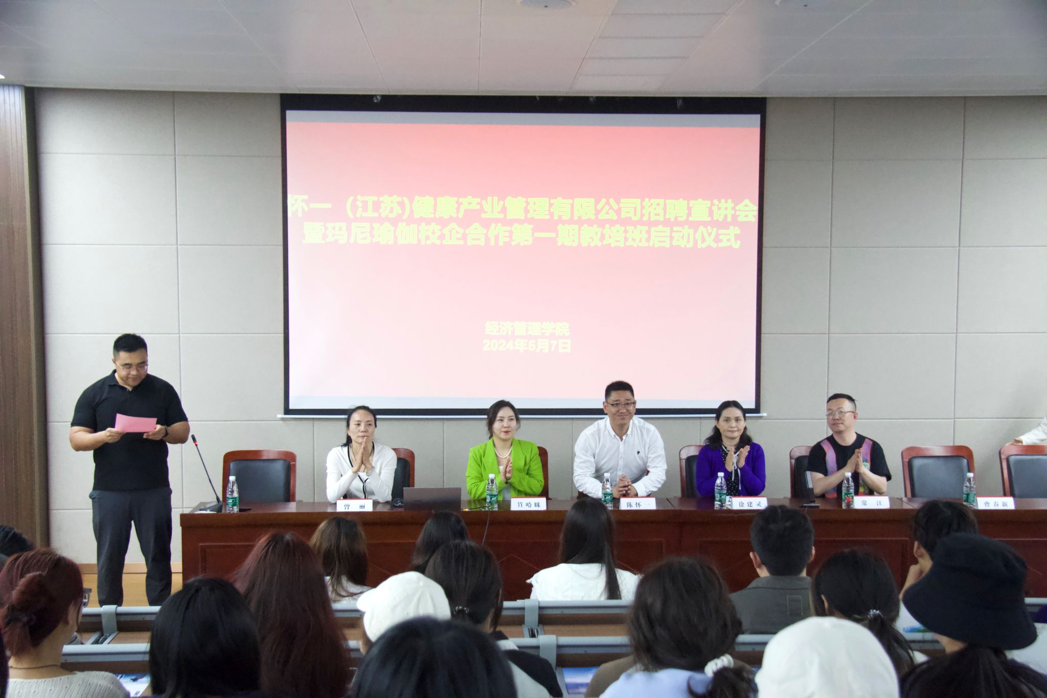 為深入貫徹落實黨中央、國務院關于高校畢業生就業工作的決策部署,切實加強學院人才培養建設、提升人才培養質量及學生就業質量,推動校企合作、深化產教融合、推進產教共生,5月7日,懷一(江蘇)健康產業管理有限公司校招宣講會暨瑪尼瑜伽校企合作第一期教培班啟動儀式在和豐樓一樓多功能報告廳舉行,會議由經濟管理學院黨總支副書記李光然主持。