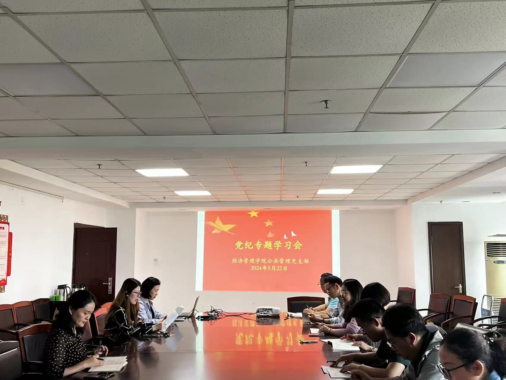 2024年5月22日中午,經(jīng)濟(jì)管理學(xué)院公共管理黨支部在綜合行政樓606會(huì)議室召開黨紀(jì)專題學(xué)習(xí)會(huì),會(huì)議繼續(xù)學(xué)習(xí)貫徹新修訂的《中國共產(chǎn)黨紀(jì)律處分條例》,公共管理黨支部書記郭婷婷主持了本次會(huì)議。經(jīng)濟(jì)管理學(xué)院黨總支書記徐建靈出席了會(huì)議。