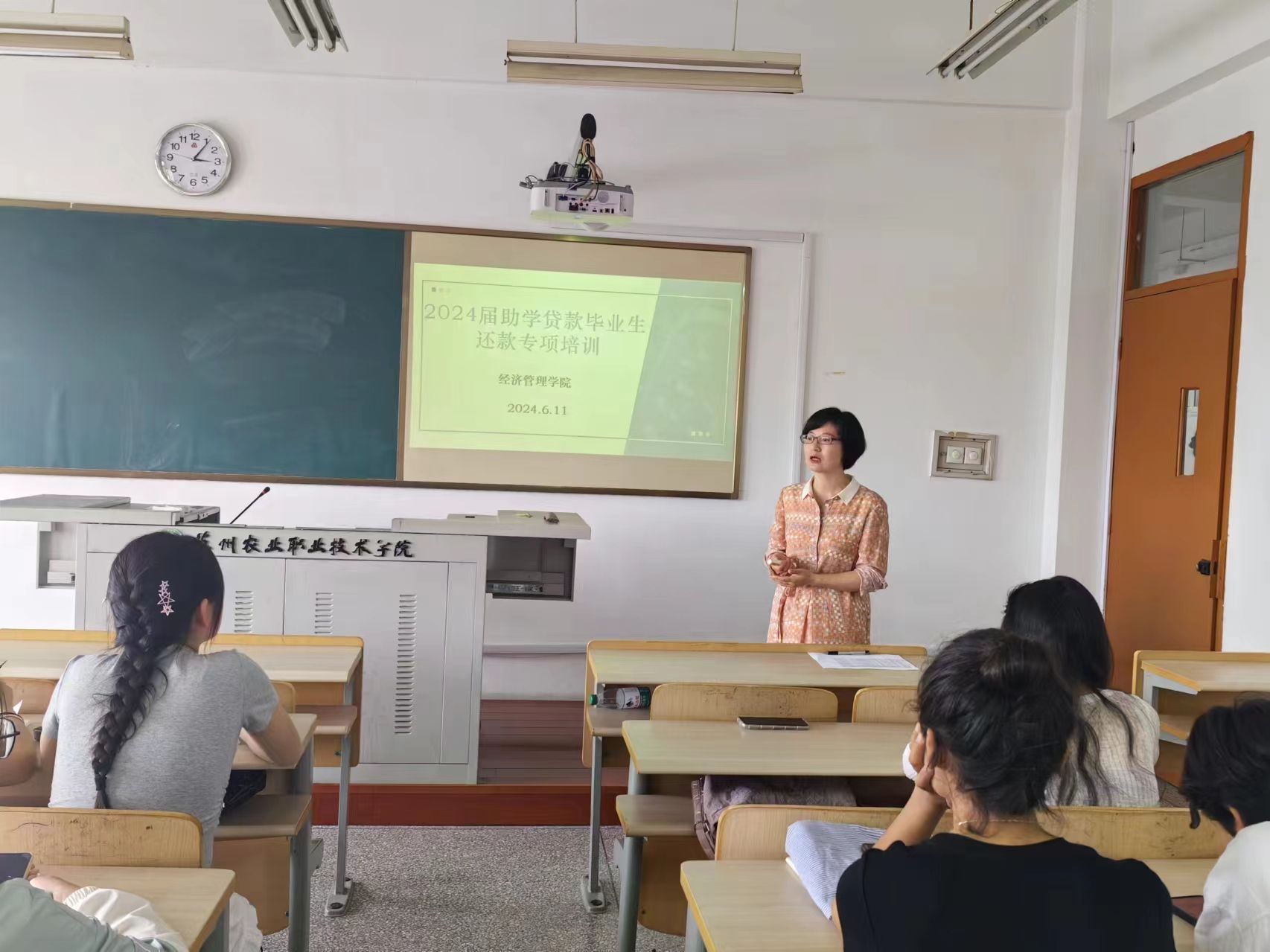 2024屆畢業生臨近畢業,即將進入還款期。為進一步加強畢業生誠信意識、履約意識,6月11日,經濟管理學院在和豐樓3606召開了2024屆畢業生還款專項培訓會議。經濟管理學院2024屆全體助學貸款畢業生參加了專項培訓,培訓會由經濟管理學院資助專員楊金紅老師主講。