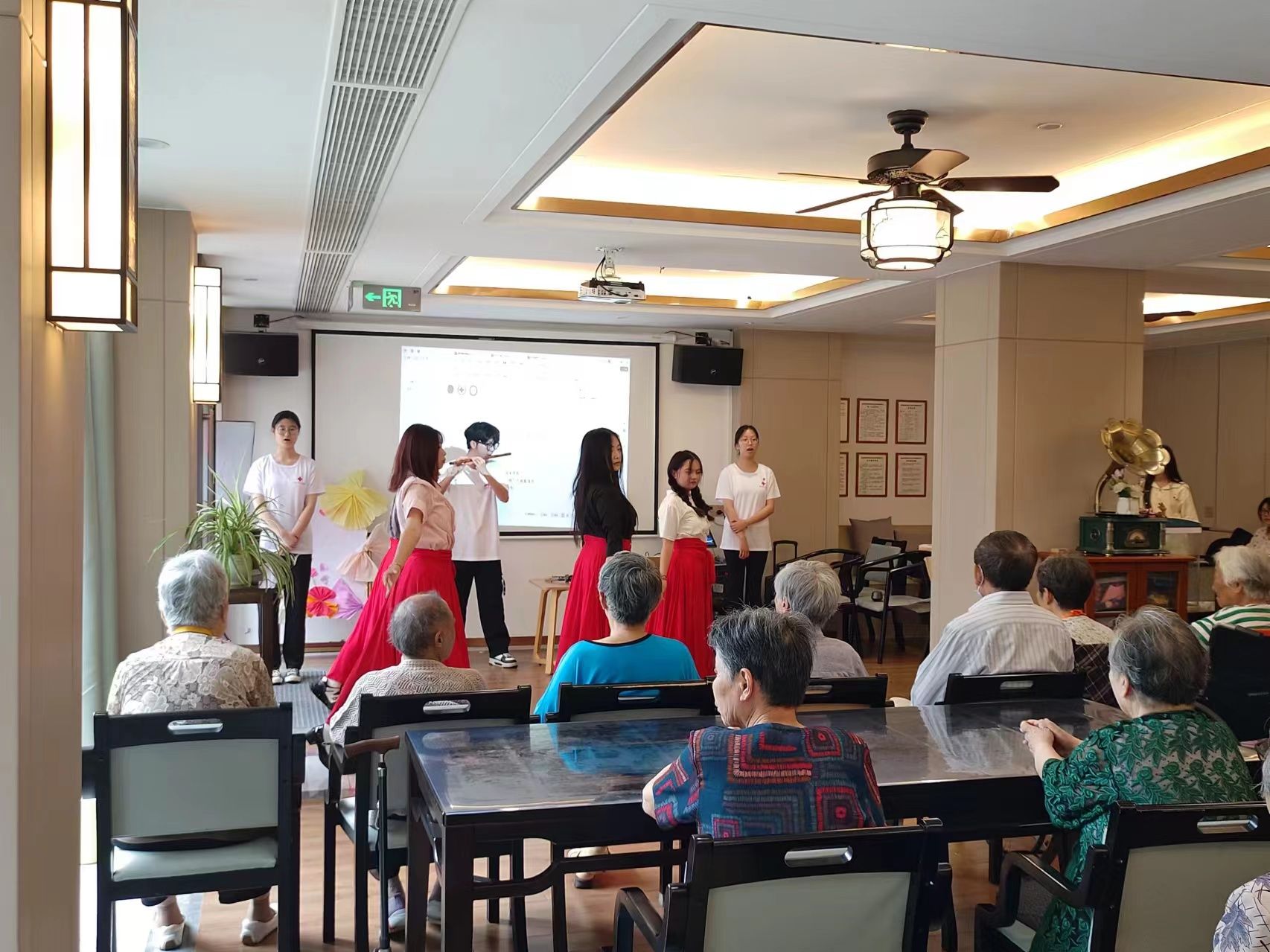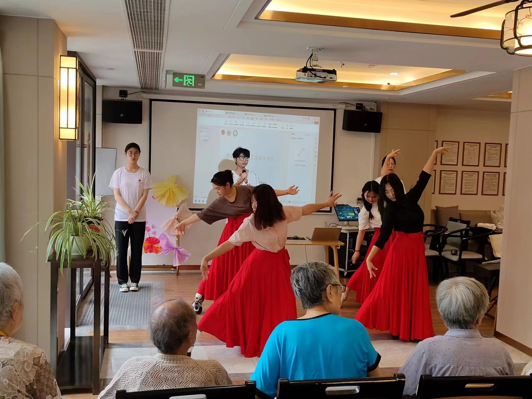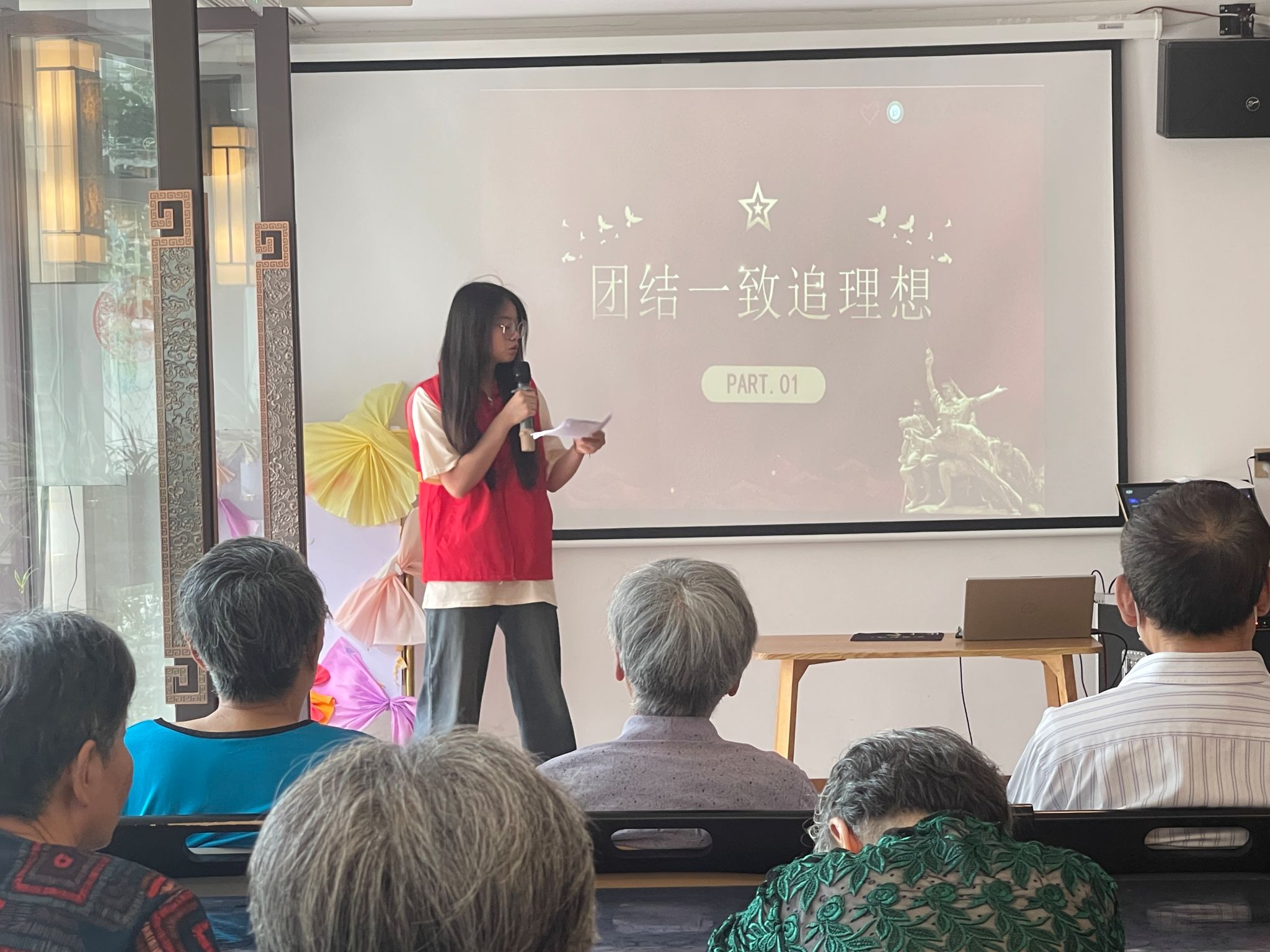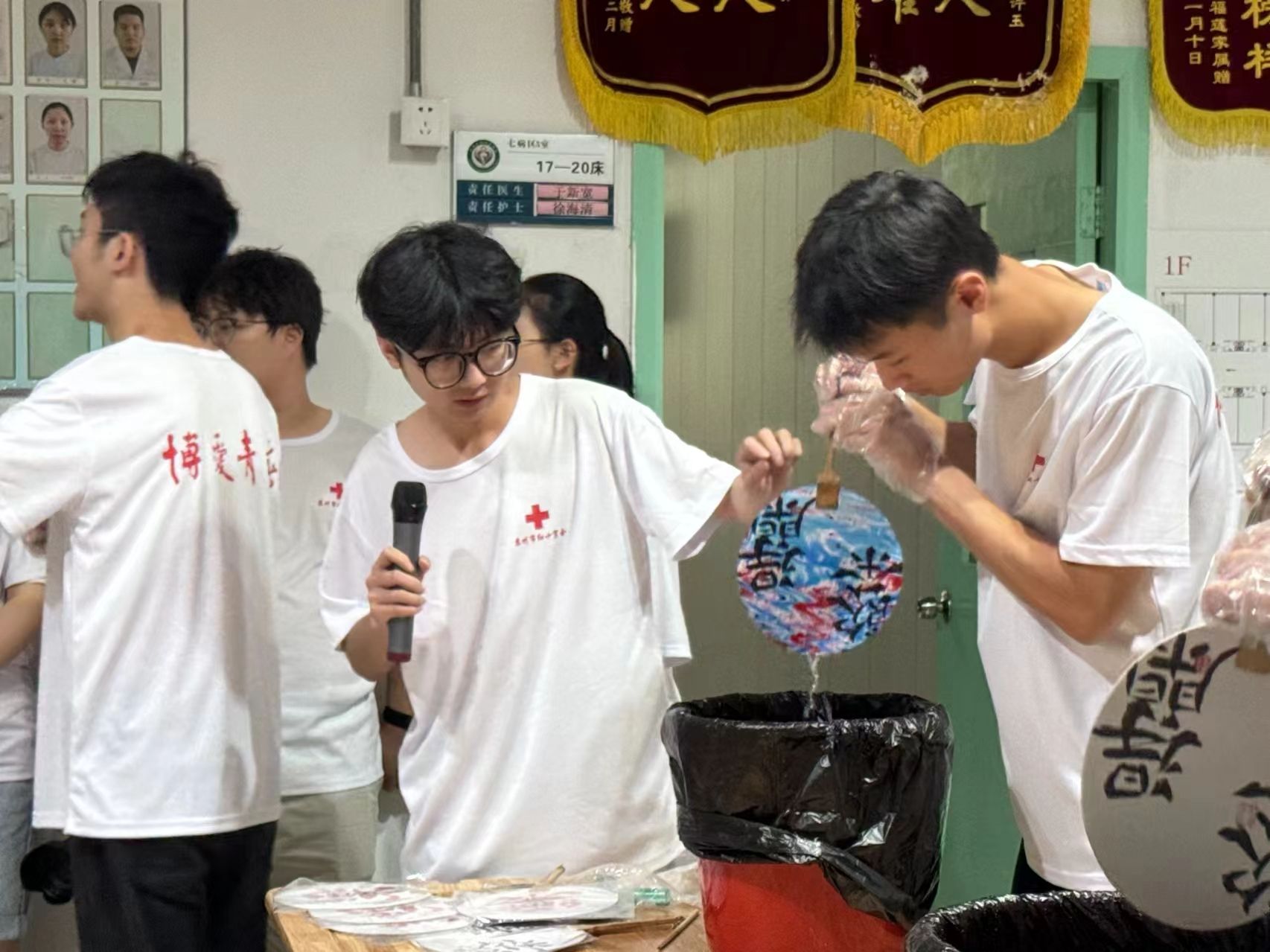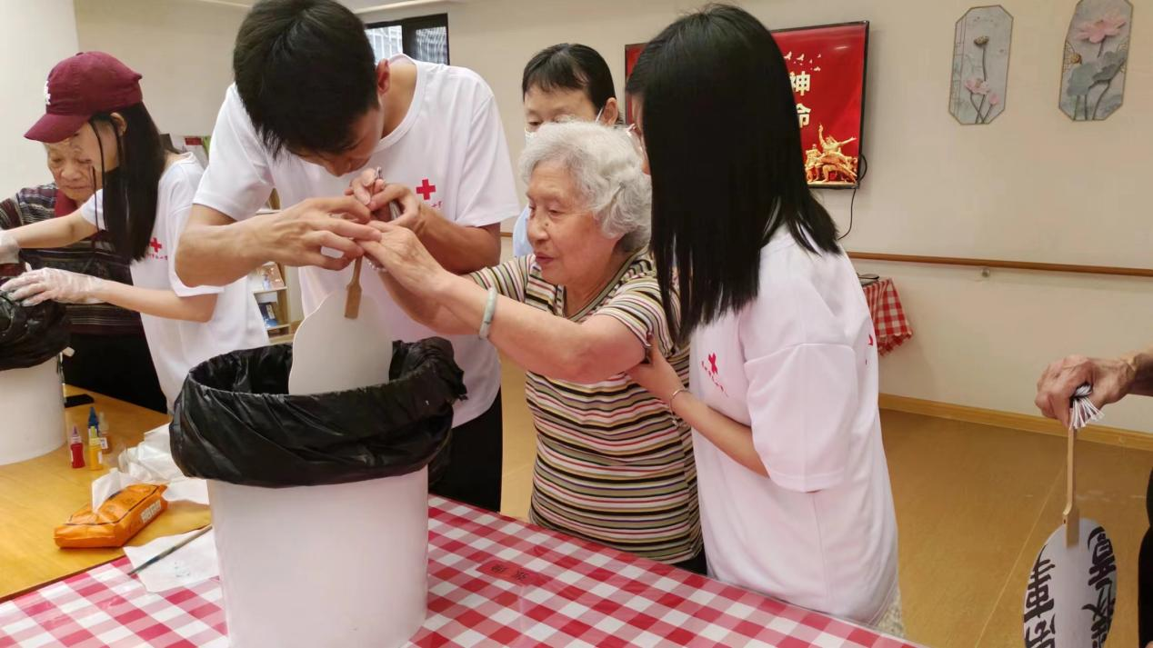 活動當天,志愿者們早早地來到了養老院,他們一進門,就受到了老人們的熱烈歡迎。志愿者們在養老院精心組織了一系列豐富多彩的活動。首先是體驗漆扇制作,志愿者們一對一指導,帶領老人體驗非遺文化,成品深受老人們喜愛。隨后,通過精彩的宣講與精美的 PPT 帶領老人們重溫延安精神,感受那個時代的艱辛與變化。接著,萬疆歌舞表演以及志愿者的笛子獨奏登場,悅耳歌聲、優美舞姿與悠揚笛音令人陶醉。最后活動之余,志愿者們還特別關注老人們的健康,進行養生之道理論宣講,推薦養生方法,并對部分行動不便的老人提供一對一照顧和穴位按壓指導服務。