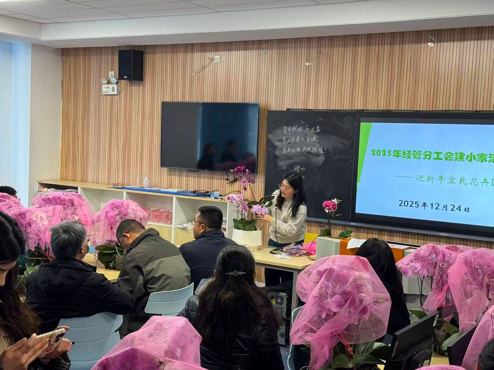 2025年12月24日中午12時30分,經管院分工會“建小家”迎新年活動在溫馨活潑的氛圍中拉開帷幕。本次活動以“蝴蝶蘭盆栽花卉DIY”為主題,吸引了學院教職工踴躍參與。學院關工委常務副主任、退休老教師顧金峰也親臨現場,與教職工們一同動手制作,喜迎新春。