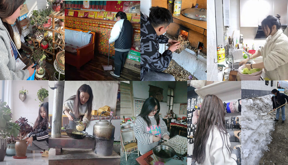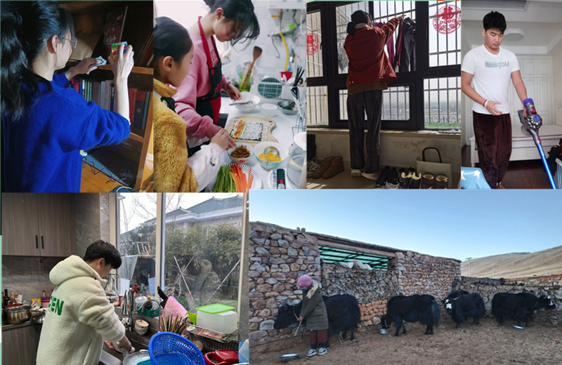 有打掃家里衛生、清掃門前的積雪;有洗衣服、整理書房內務;有打理陽臺花草;有喂養家里牲畜,清理寵物垃圾;也有刷碗、洗菜;更有炒幾道小菜,包個餃子,慰藉父母為家庭的付出;還有幫父母打理一下生意,體味父母工作的辛苦……