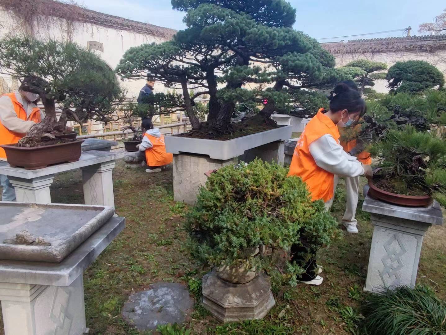 “除草添綠進行時”。園林青協志愿者們分為三組,一組為花草修剪鏟除雜草;一組給盆景區的“貴族”們澆水施肥養護;一組為留園溫室花房里“少女”花草多肉整理收納。