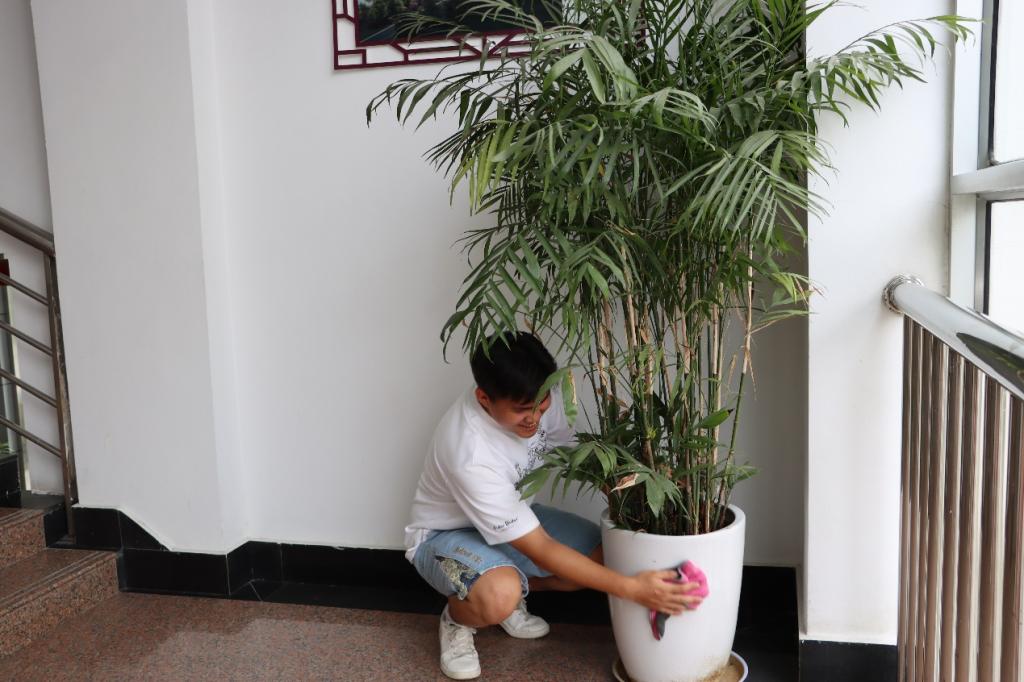 活動中,學生黨員和積極分子們通過對圖書館公共區(qū)域綠植統(tǒng)一進行培土施肥、殺蟲養(yǎng)護、清洗除塵,增添了閱覽室的綠意與生機,為師生營造舒心悅目的閱讀環(huán)境。