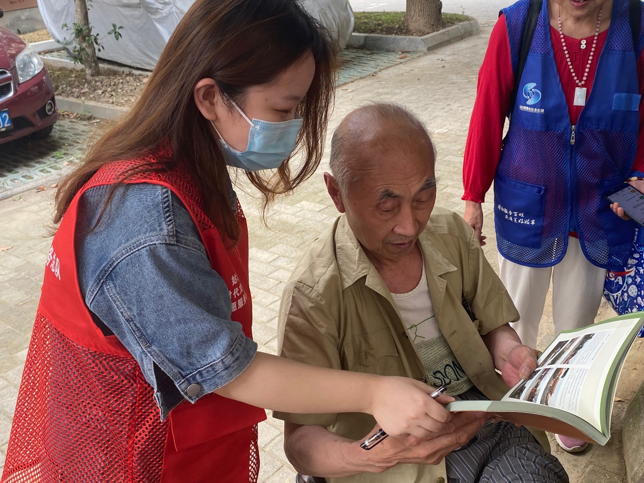 活動(dòng)中,志愿者們借助園林專業(yè)書籍為老年人帶來園林景觀方面的信息,以邊讀邊聊的方式讓老年人能夠更好的掌握相關(guān)知識(shí)。由于老年人閱讀不方便,志愿者們主動(dòng)為老年人朗讀書中精彩內(nèi)容,增進(jìn)溝通交流,與老人建立良好關(guān)系的同時(shí)營(yíng)造社區(qū)文化氛圍。隨后,志愿者進(jìn)行手把手教學(xué),給老人講解如何使用智能手機(jī)和網(wǎng)絡(luò)電視,讓老人感受到來自社會(huì)、來自志愿者的關(guān)懷。