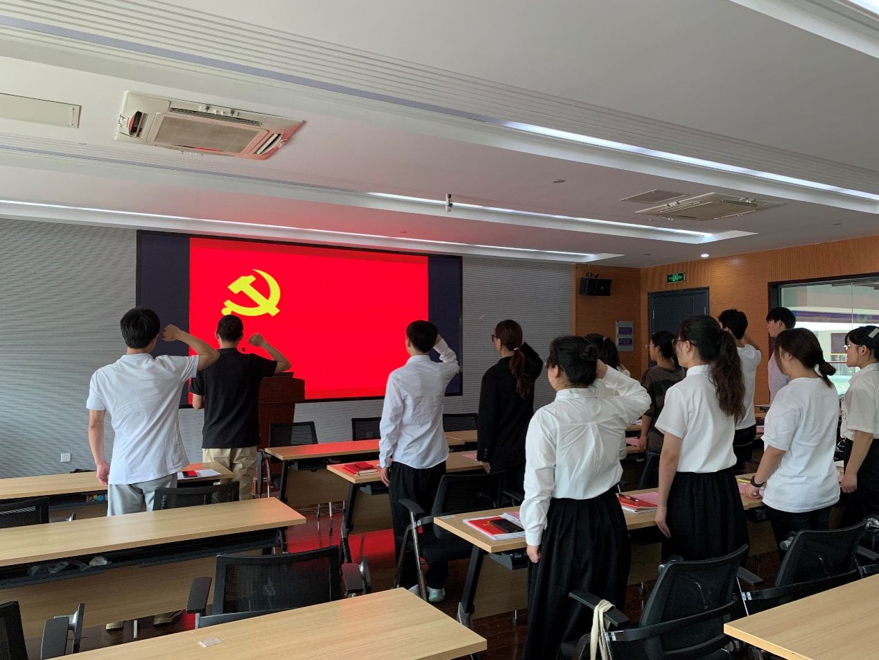 大會最后,全體新黨員面向黨旗,舉起右拳進行了莊嚴的集體宣誓。