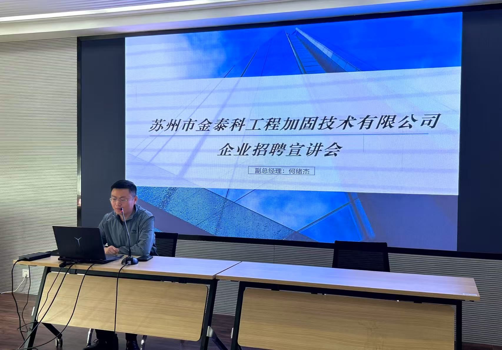 宣講會上,蘇州市金泰科工程加固技術(shù)有限公司副總經(jīng)理何緒杰詳細(xì)介紹了行業(yè)現(xiàn)狀、公司簡介、工程業(yè)績、人才培養(yǎng)體系及崗位需求,重點分享了建筑加固行業(yè)的發(fā)展趨勢和職業(yè)成長路徑。學(xué)生們就崗位職責(zé)、晉升機制、實習(xí)待遇等問題與企業(yè)代表積極互動,進(jìn)一步明確了職業(yè)規(guī)劃方向。