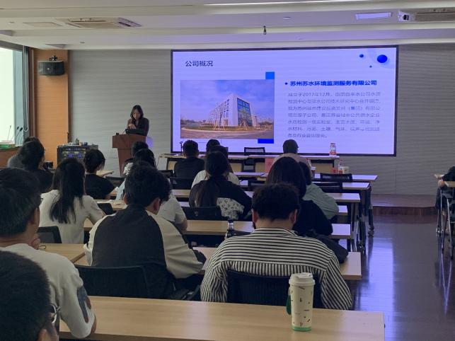 宣講會上,蘇州蘇水環境監測服務有限公司綜合部主任徐麗介紹了公司的基本情況、核心業務領域、工作環境與條件和員工福利待遇,分享了行業內的前沿動態與發展趨勢。公司現場人事部經理常宇萌,為同學們詳細講解了公司在環境檢測方面的業務范圍、現場采樣工作的具體內容與要求,以及在檢測行業中個人職業發展的路徑與空間。