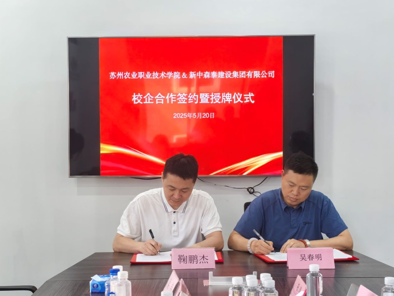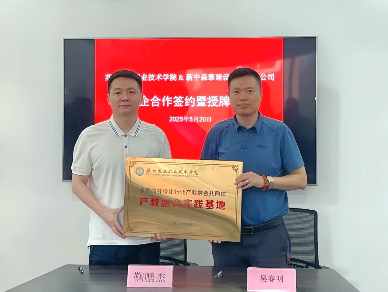 5月20日,園林工程學院與蘇州新中森泰建設集團有限公司舉行校企合作簽約暨授牌儀式。學院副院長鞠鵬杰、公司總經理吳春明及雙方代表出席活動。鞠鵬杰表示,此次合作旨在推進產教融合,精準對接行業需求,拓寬學生實習就業渠道,助力培養高素質園林技術人才。