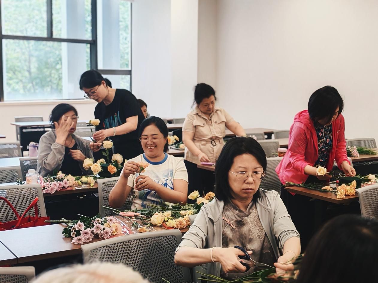 活動緊扣“園林康養”主題,支部黨員教師王荷結合《詩經》《黃帝內經》等經典,深入淺出地闡釋了插花常見花卉的文化寓意與康養價值。她詳細講解了玫瑰舒緩情緒、菊花安神寧氣、百合清心潤肺、萱草花象征母愛與親情等文化內涵,凸顯園林花卉植物在身心康養中的獨特作用。結合老年群體需求,王荷老師現場示范了以月季為基調,搭配菊花、康乃馨、桔梗等花材的兼具觀賞性與療愈性的主題花束;王夢茜、鄒衛妍、梁錚等黨員教師對老年學員進行“一對一”協助的指導實踐。老年學員們沉浸體驗園林植物插花創作,感受一花一草的芳香浸潤,放松身心,同時通過黨員教師指導,學員之間互相幫助,體驗人與人之間的情感流動和支持聯結。