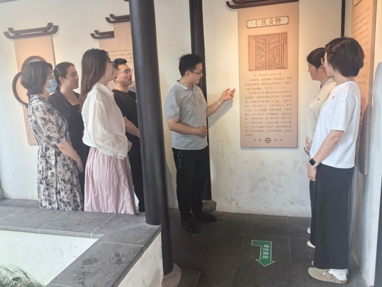 紀念館內(nèi),支部書記姚嵐結(jié)合白居易“疏浚山塘河、淤泥筑堤、桃李固土”的生態(tài)實踐,闡釋其現(xiàn)實啟示:“守廉是教育者的職業(yè)生命線,匠心須以清正為底色。園林專業(yè)教師當(dāng)以白公為鑒,將廉潔基因深植課程教學(xué)與人才培養(yǎng)。”支部成員朱方達說,教學(xué)中可以將白居易“以工代賑”“生態(tài)固堤”智慧作為課程案例,還可以開發(fā)“廉潔園林”實踐項目,引導(dǎo)學(xué)生傳承“精工為民”工匠精神。