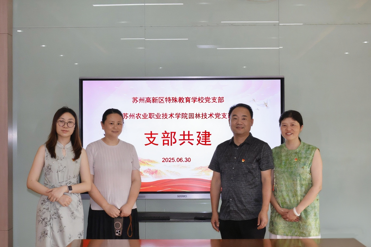 為深化黨建引領基層治理,推動教育資源互補共享。6月30日,園林技術黨支部與蘇州高新區特殊教育學校黨支部聯合開展支部共建活動。通過"黨建+專業"創新模式,為特殊學生群體打造沉浸式自然教育課堂,探索高校與特教學校協同育人新路徑。蘇州高新區特殊教育學校黨支部書記陳永平、德育處主任閻凌蕓,園林技術黨支部書記姚嵐、宣傳委員孫瑜出席活動。
