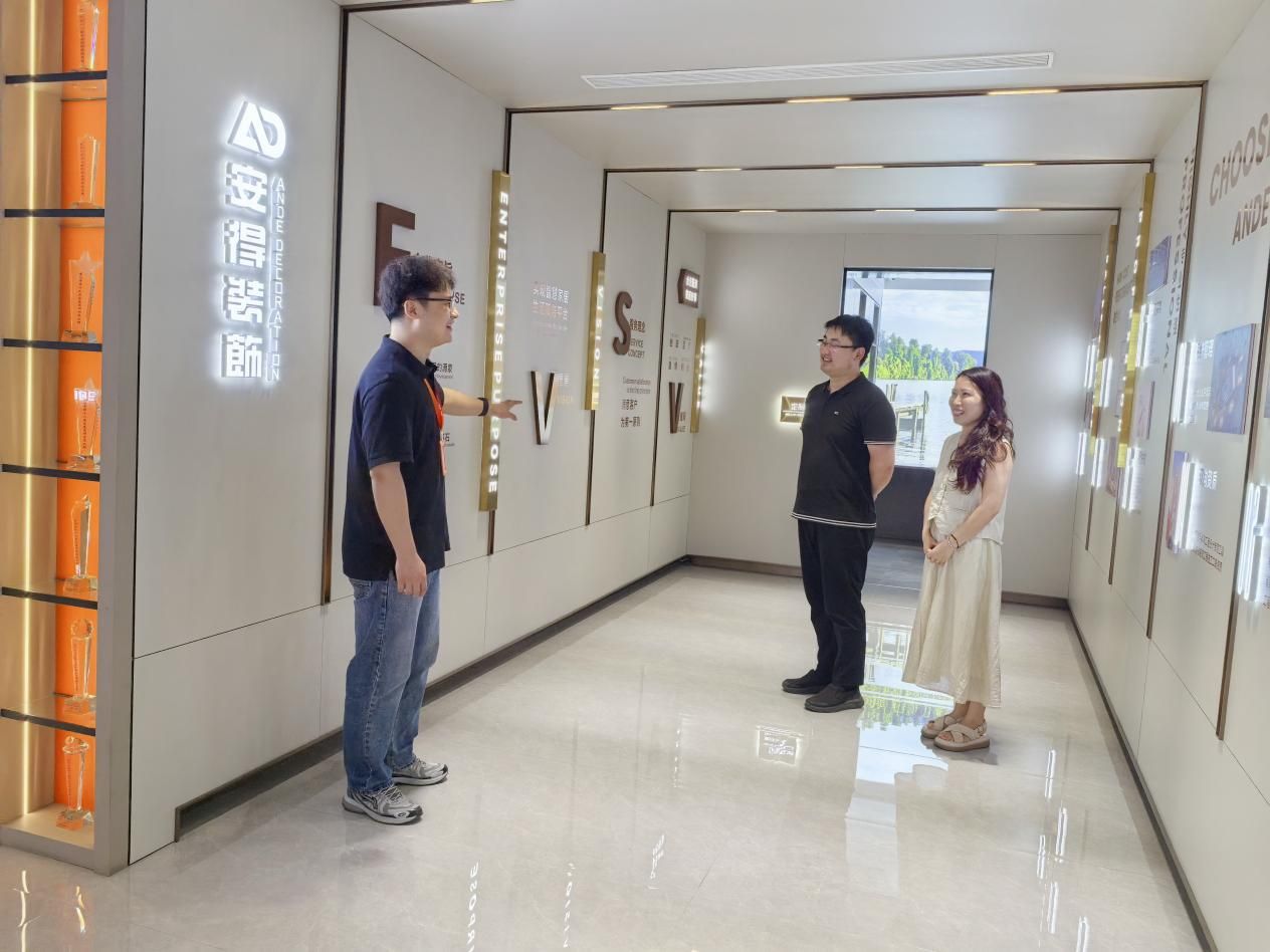 在蘇州安得裝飾集團(tuán),集團(tuán)主案設(shè)計(jì)師袁一凡引領(lǐng)老師們參觀了公司環(huán)境,并詳細(xì)介紹了企業(yè)的發(fā)展?fàn)顩r、業(yè)務(wù)領(lǐng)域及人才需求等情況。隨后,雙方就室內(nèi)設(shè)計(jì)專業(yè)的發(fā)展、人才培養(yǎng)現(xiàn)狀以及建筑室內(nèi)設(shè)計(jì)專業(yè)的頂崗實(shí)習(xí)需求進(jìn)行了深入洽談。雙方圍繞產(chǎn)教融合、學(xué)生就業(yè)等議題展開(kāi)深度交流,共同期待進(jìn)一步強(qiáng)化校企合作力度,共建校企合作基地。