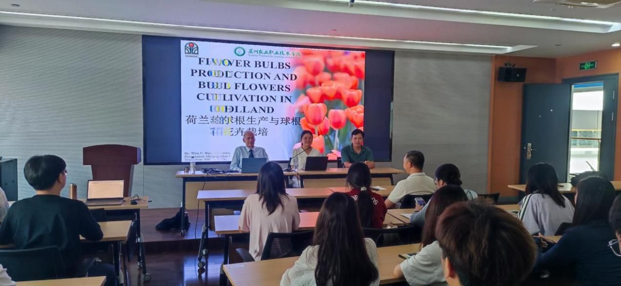 2025年9月15日,蘇州農業職業技術學院園林工程學院與中荷農業部上海園藝培訓示范中心聯合開展“荷蘭球根花卉生產與栽培”專題講座。邀請原荷蘭農業部技術顧問、國際園藝專家WIM WEERDENBURG威姆先生擔任主講,林草生態保護與修復、園林技術等專業100余名師生共同參與學習。