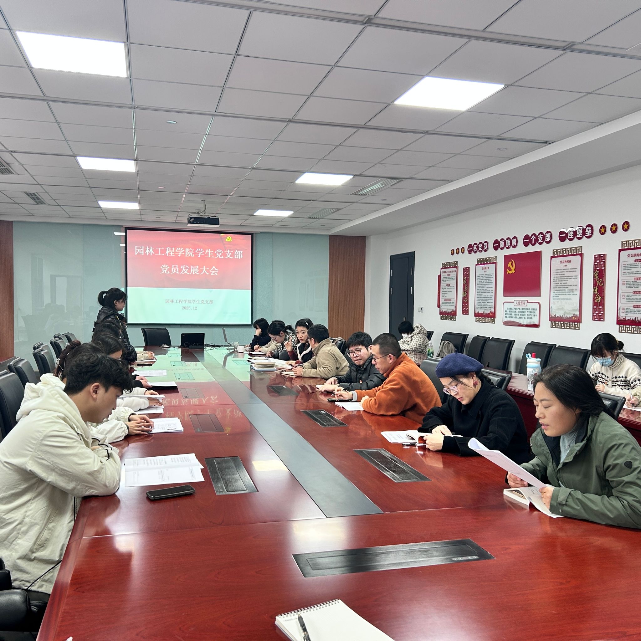 2025年12月18日,園林工程學院學生黨支部在217會議室召開黨員發展大會,討論接收俞思彤、王淑婷等7位同志為中共預備黨員。學院黨總支副書記徐崢、入黨介紹人及支部全體師生黨員參加會議,會議由學生黨支部書記謝君娜主持。
