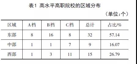 表1所示,高水平高職院校的區(qū)域分布不平衡性極其顯著,東部地區(qū)無(wú)論從數(shù)量還是質(zhì)量上都占有絕對(duì)優(yōu)勢(shì)。數(shù)量上看,東部地區(qū)高水平高職院校共有32所,占比57.14%。其次是西部地區(qū)共有高水平高職院校15所,占比26.79%。從質(zhì)量上看,A檔和B檔高水平高職院校均以東部地區(qū)為主,都占比該層次的80%。而C檔高水平高職院校以西部地區(qū)為主力,占比42.31%,其次仍然是東部地區(qū),占比30.77%。