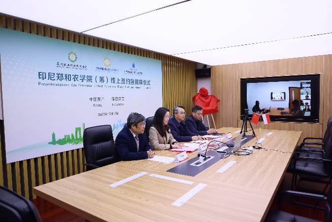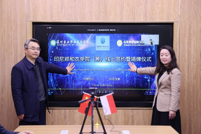 12月19日, 我校與印度尼西亞日惹梅爾庫布阿納大學(xué)、馬來西亞國際文化交流中心共同舉行蘇州農(nóng)業(yè)職業(yè)技術(shù)學(xué)院印尼鄭和農(nóng)學(xué)院(籌)線上簽約暨揭牌儀式。學(xué)校黨委委員、副校長孔婷婷、園藝科技學(xué)院院長尤偉忠、國際合作交流處副處長許建生、園林工程學(xué)院副院長余俊及國際合作交流處全體人員參加了本次活動。