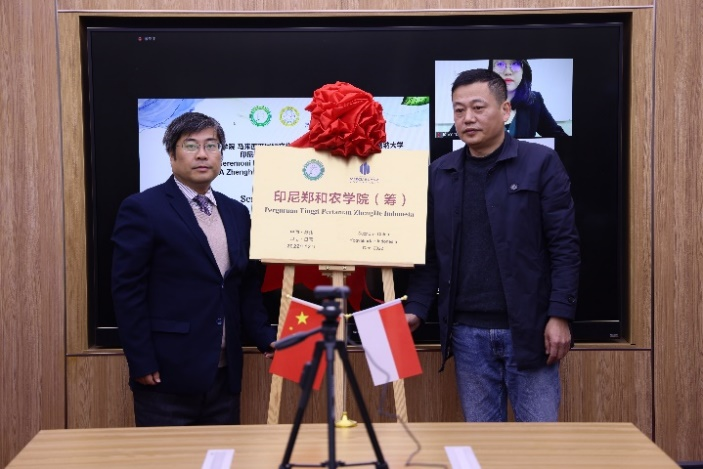 活動中,我校副校長孔婷婷、日惹梅爾庫布阿納大學(xué)農(nóng)業(yè)技術(shù)研究項(xiàng)目主席班邦·奴戈羅霍博士和馬來西亞國際文化交流中心總經(jīng)理呂慧恩女士先后致辭,并分別代表三方“云”簽署了合作協(xié)議。許建生、余俊為“印尼鄭和農(nóng)學(xué)院(籌)”揭牌,孔婷婷、尤偉忠與印尼方共同啟動項(xiàng)目。