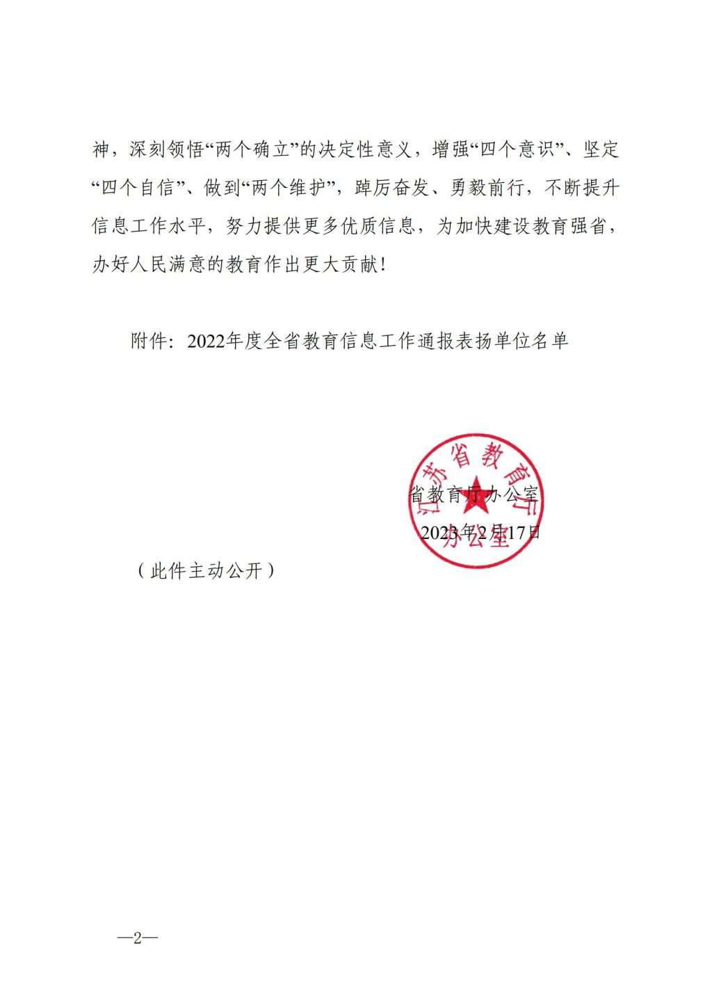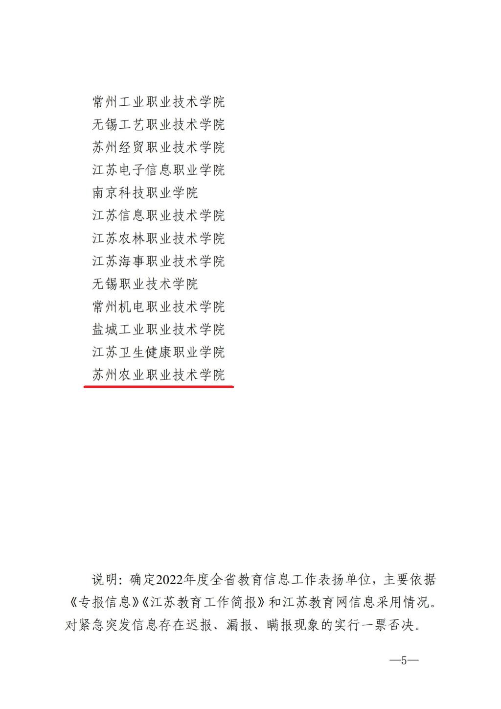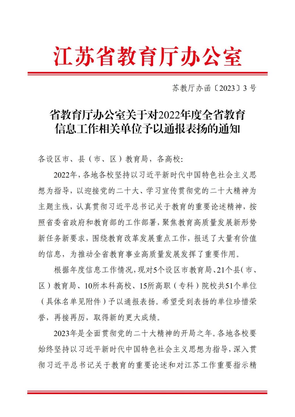 近日,江蘇省教育廳辦公室發(fā)布了《關(guān)于對(duì)2022年度全省教育信息工作相關(guān)單位予以通報(bào)表?yè)P(yáng)的通知》(蘇教廳辦函〔2023〕3 號(hào)),根據(jù)年度信息工作情況,對(duì)5個(gè)設(shè)區(qū)市教育局、21個(gè)縣(市、區(qū))教育局、10所本科高校、15所高職(??疲┰盒9?1個(gè)單位予以通報(bào)表?yè)P(yáng)。我校獲評(píng)“全省教育信息工作表?yè)P(yáng)單位”。