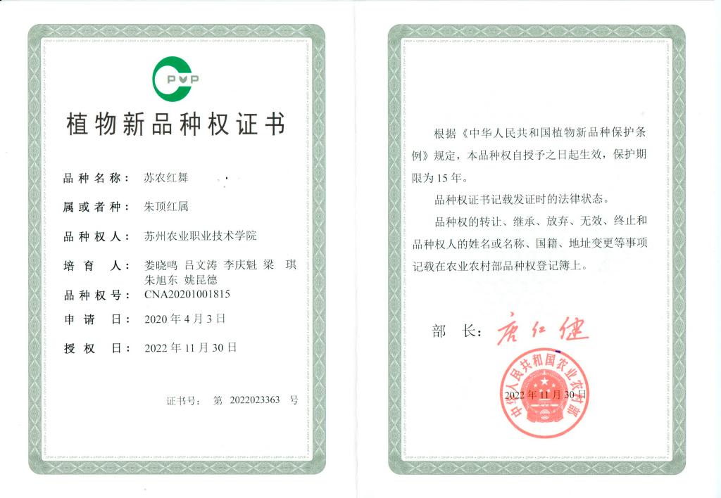近日,由我校球根花卉種質(zhì)資源庫選育的“蘇農(nóng)紅舞”朱頂紅新品種榮獲國家農(nóng)業(yè)農(nóng)村部植物新品種權(quán)。這是我國首批授權(quán)的朱頂紅屬植物新品種權(quán)。