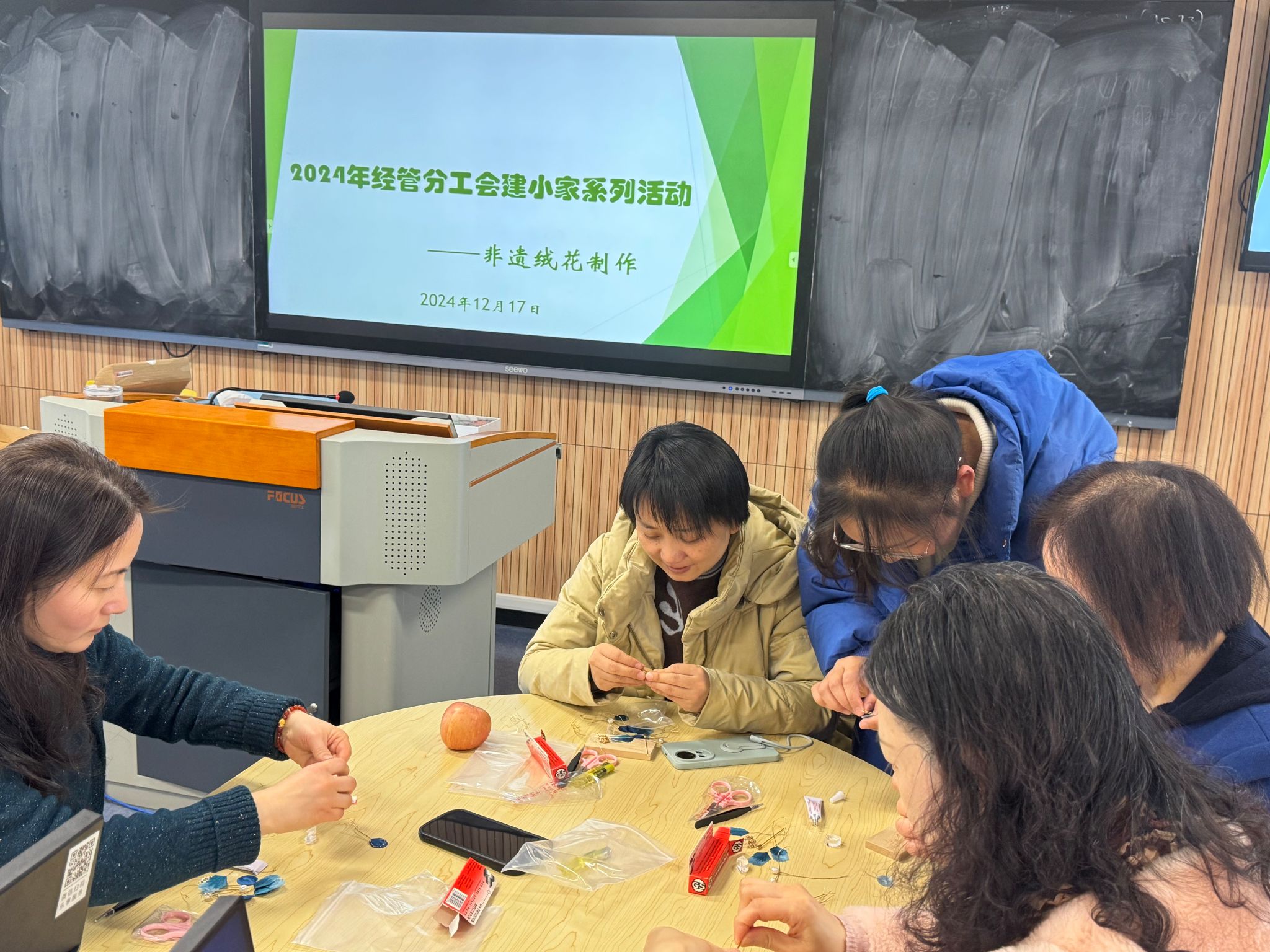 主題建小家活動在和豐樓3215教室舉行,吸引了經管院大部分教職工的積極參與。在專業老師的指導下,大家學習了絨花的歷史淵源、工藝特征以及制作流程。通過親手體驗勾條、打尖、傳花等關鍵步驟,大家不僅鍛煉了動手能力,也深刻感受到了傳統手工藝的魅力。