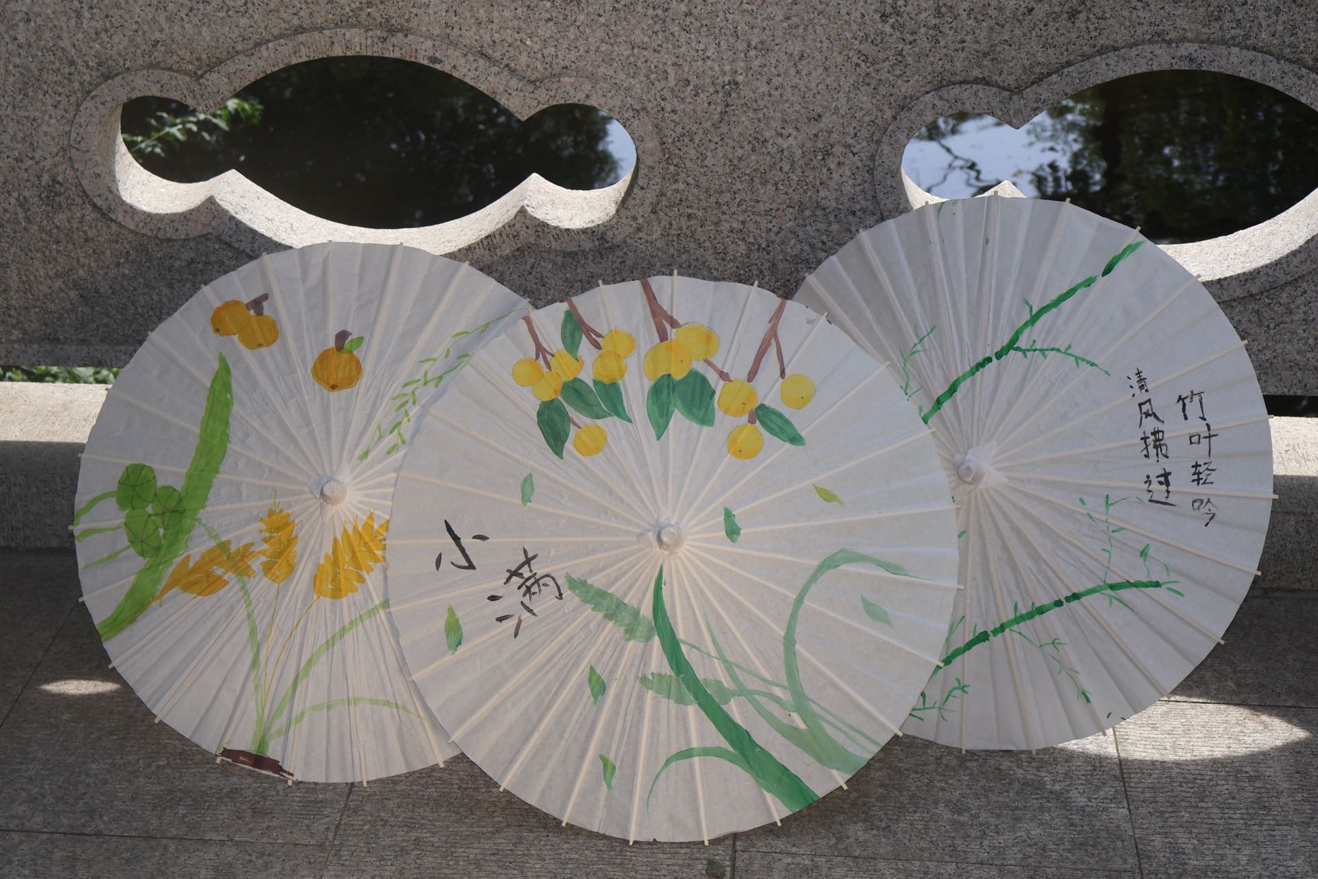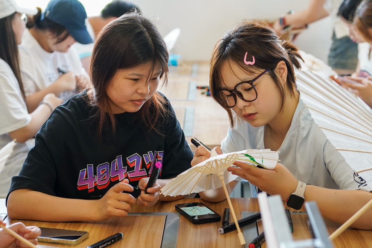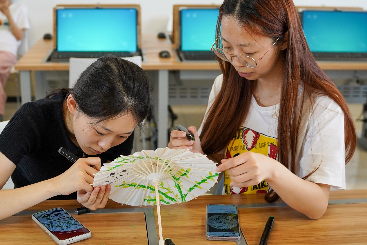 在油紙傘創作環節,學院為同學們準備了素白油紙傘和傳統繪畫工具。隨后,同學們以“二十四節氣”“古典詩詞”“傳統紋樣”為主題展開創作:有的繪制憨態可掬的熊貓,有的臨摹傳統畫作的景觀,還有的書寫《詩經》中的經典詩句。活動現場,身著漢服的同學手持油紙傘即興展示傳統禮儀,為創作環節增添了一抹古韻。最終完成的30余把油紙傘在展示區形成壯觀“傘陣”,孫美同學分享道:“當筆尖觸碰傘面的那一刻,我感受到了與千年文化的對話。”