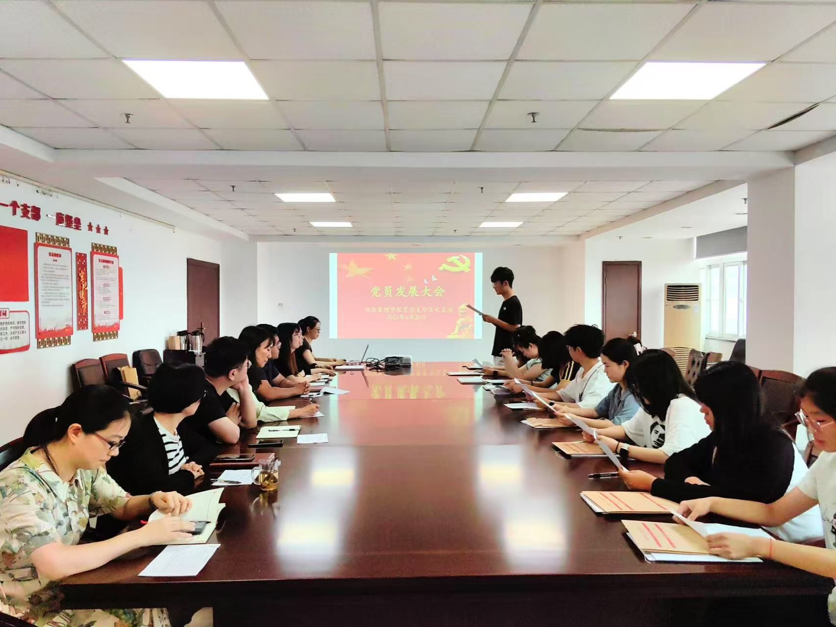 為扎實推進黨員隊伍建設,持續提升黨組織的凝聚力與戰斗力,著力打造一支素質過硬、本領高強、勇于擔當的黨員隊伍,經濟管理學院學生黨支部于2025年6月20日在606會議室召開預備黨員接收大會。參加會議的有經濟管理學院黨總支副書記李光然、學生黨支部教師黨員及發展對象。會議由學生黨支部書記劉瑩主持。