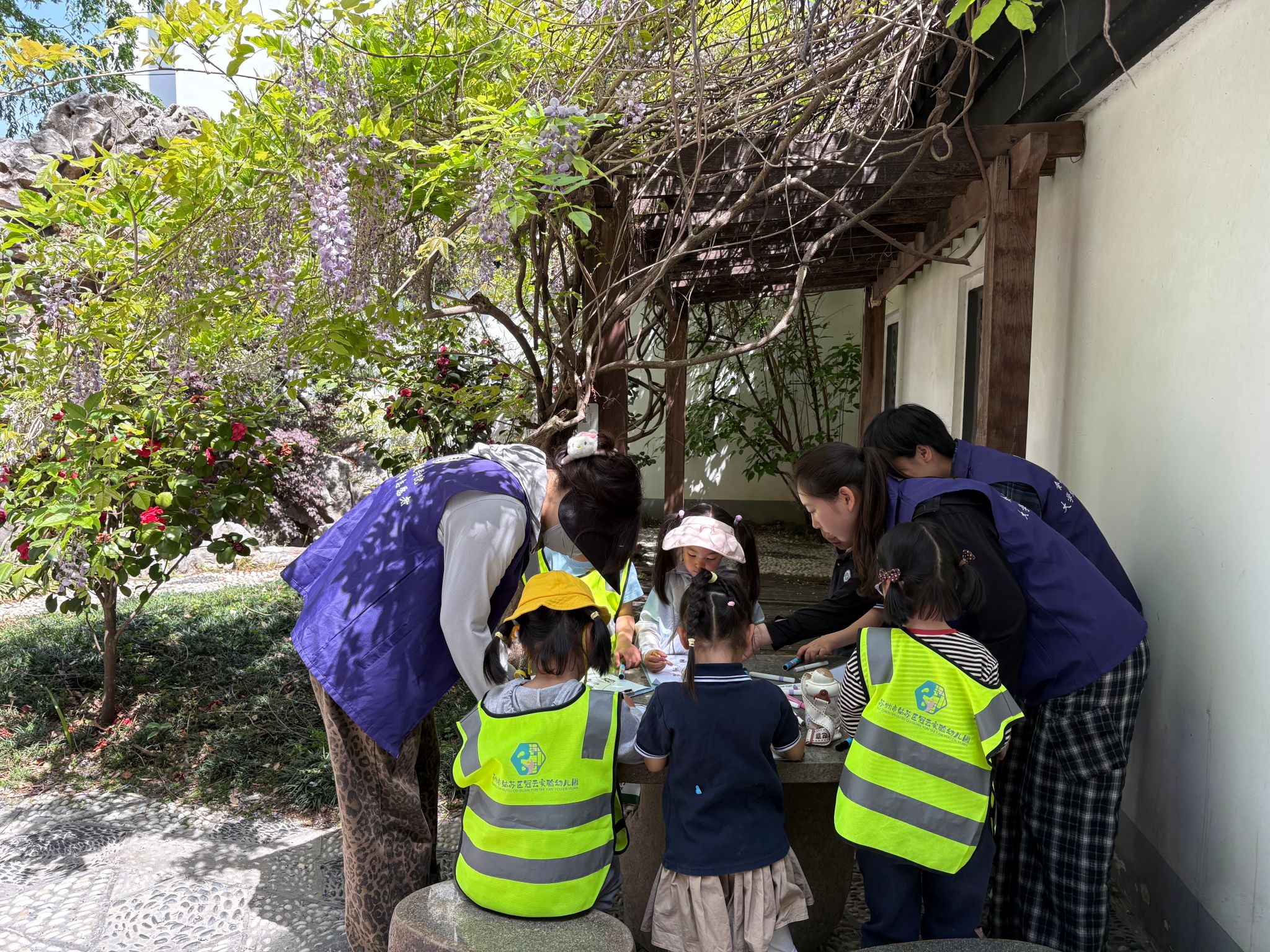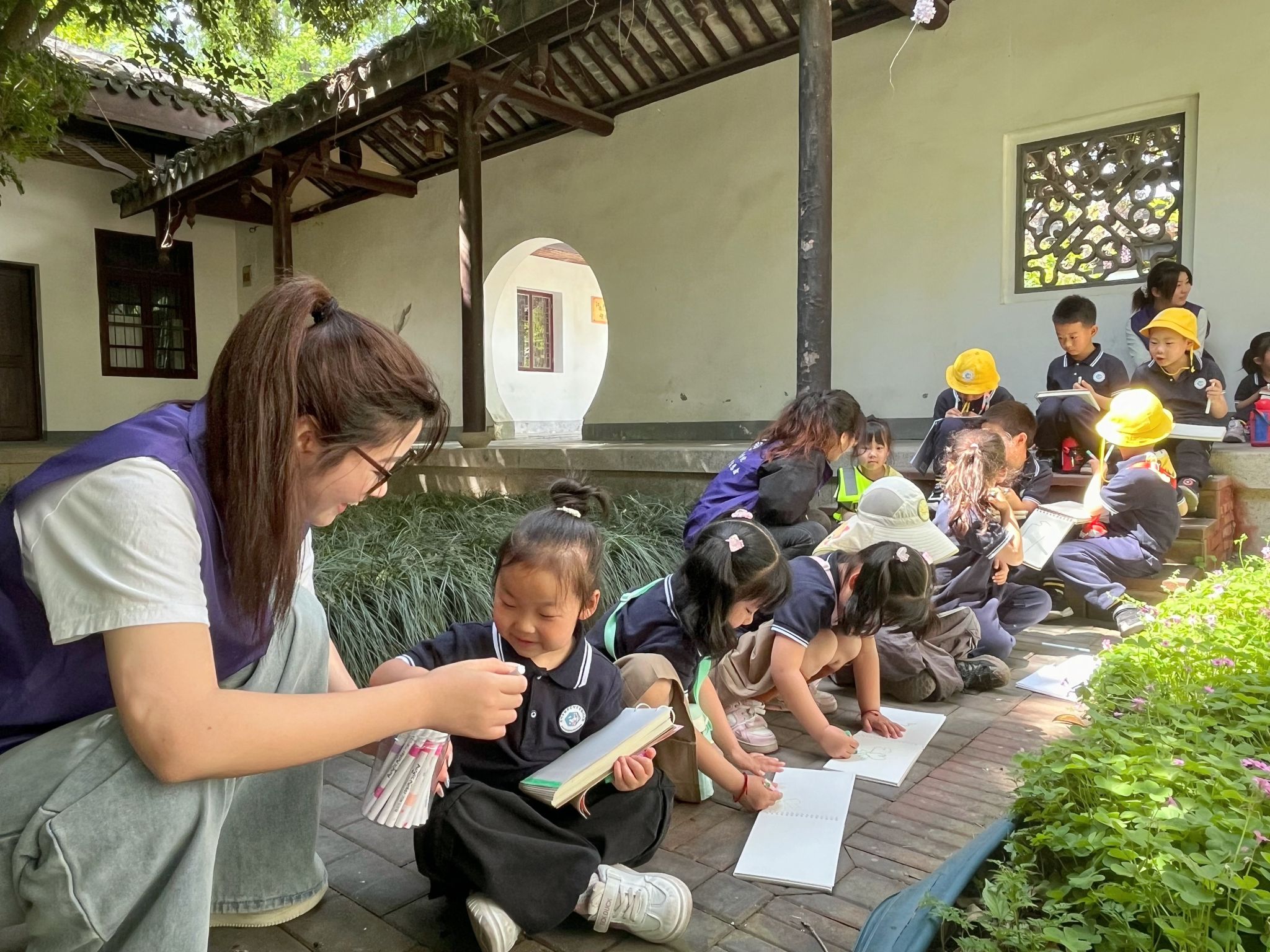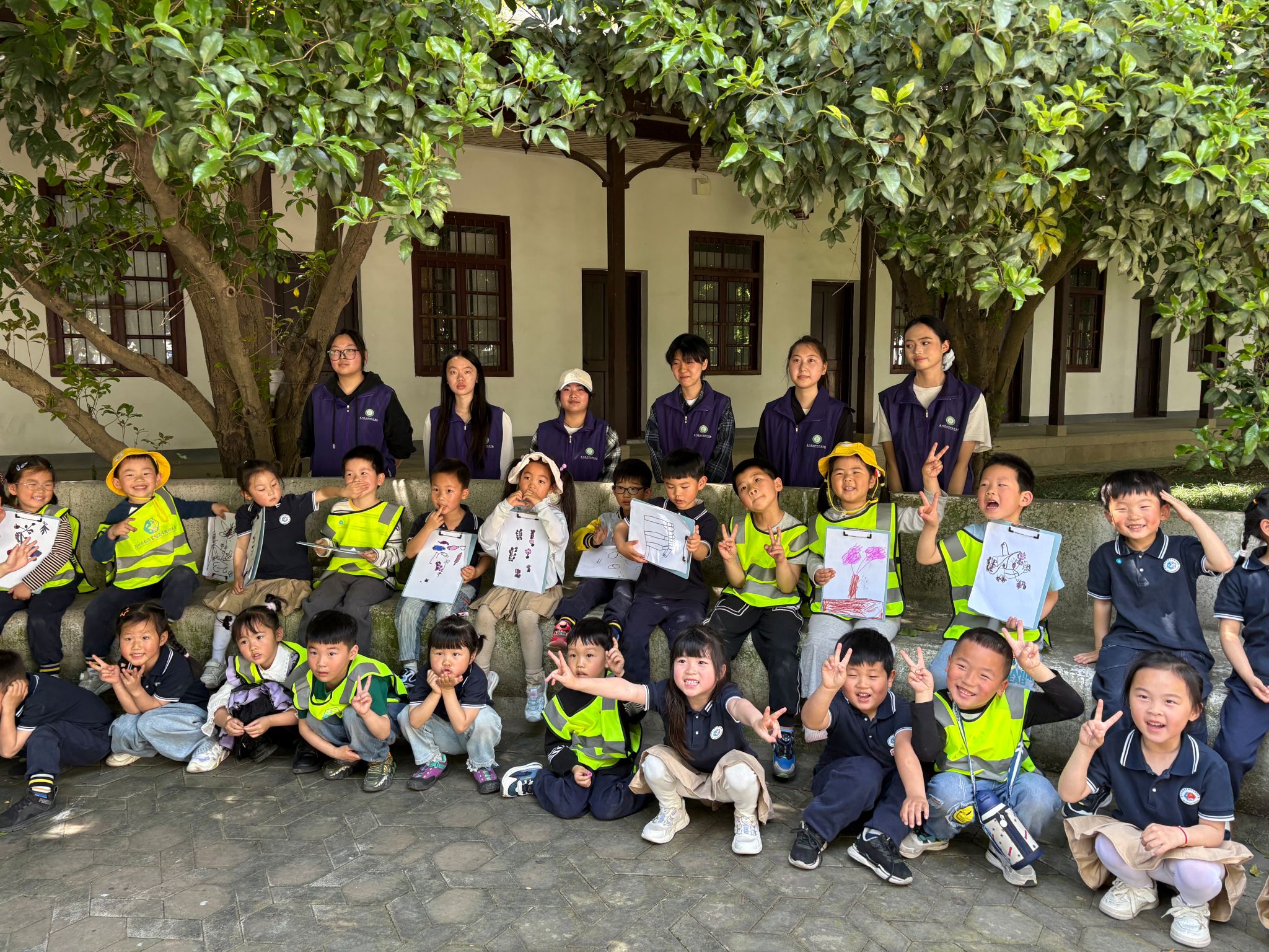 繪畫環(huán)節(jié)中,中班的孩子們與志愿者們分組合作,在學(xué)校校史館的長廊下,用畫筆在畫板上共同創(chuàng)作“我眼中的春天”。志愿者們一邊指導(dǎo)孩子們涂色,一邊講述園內(nèi)花草的自然知識,并巧妙融入愛國愛黨教育?!敖憬悖蚁氘嬕欢湫〖t花送給黨!”“姐姐,我也要畫……”小朋友們在現(xiàn)場七嘴八舌地討論起來。最后,大家手持畫作合影留念,將春天的美好與溫暖定格。