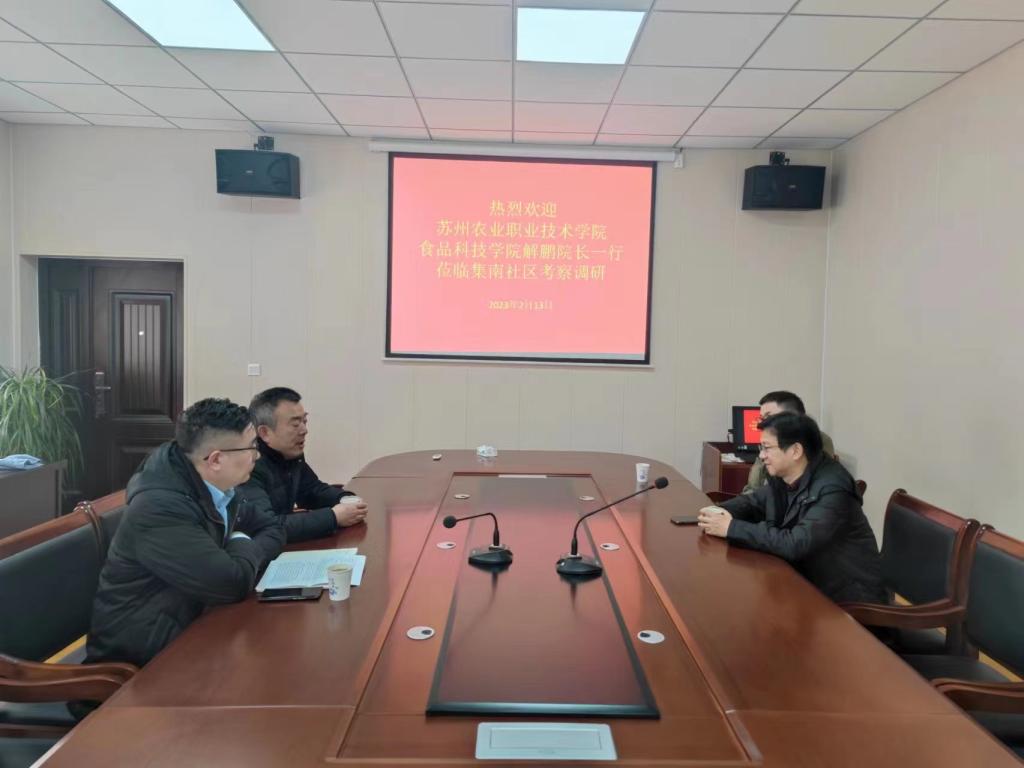 為發(fā)揮專業(yè)和人才優(yōu)勢,積極參與鄉(xiāng)村振興工作,2023年2月13日,我校食品科技學(xué)院院長解鵬一行,赴宿遷宿城區(qū)集南社區(qū)開展鄉(xiāng)村振興工作調(diào)研。集南社區(qū)黨支部書記蔡志云、集南社區(qū)掛職第一書記吳晨奇接待我校人員。