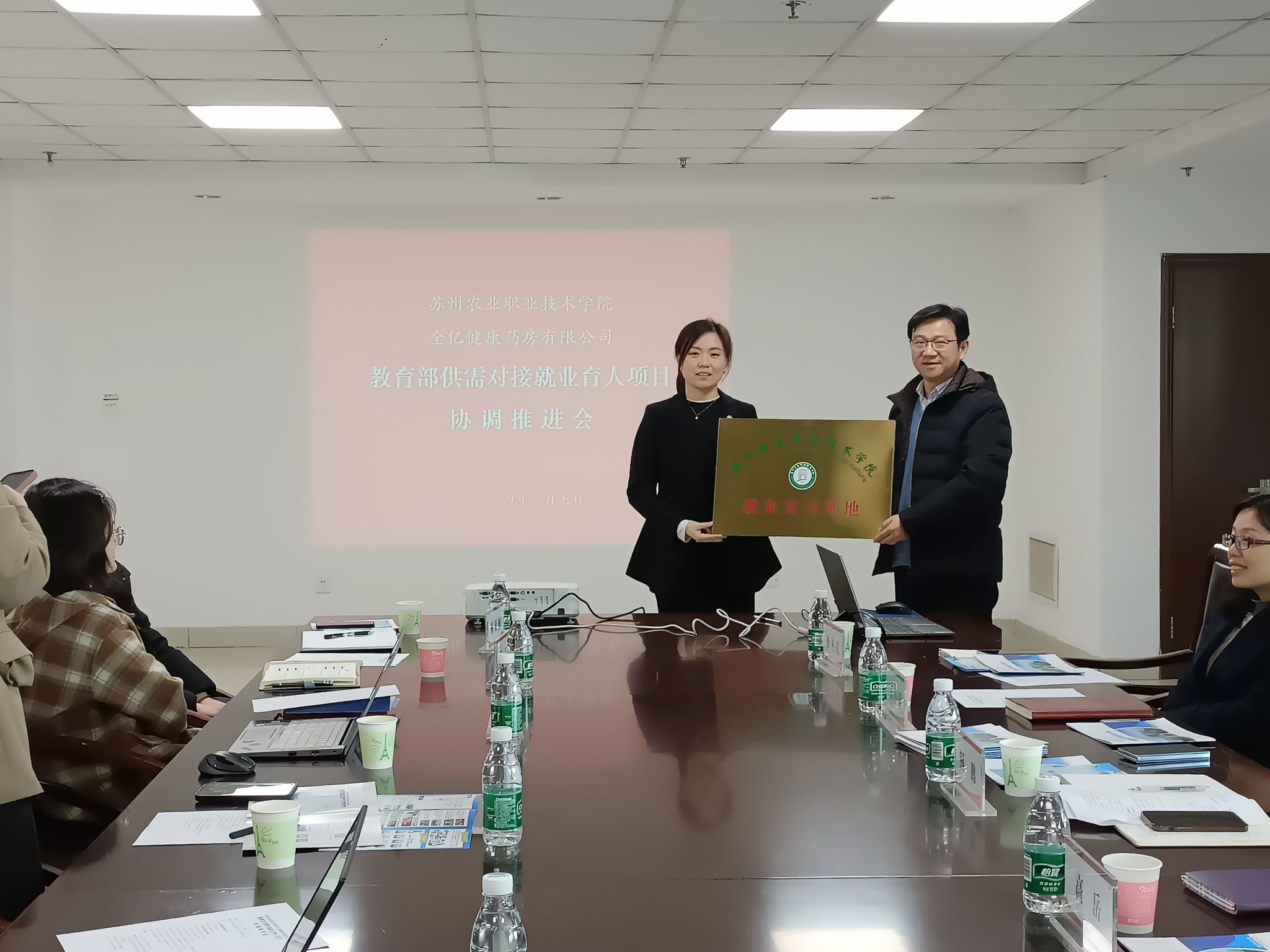 解鵬院長向企業專家表示歡迎,簡要介紹了我校及食品科技學院基本情況和蘇農-全億健康“三協同”就業育人項目的實施計劃。張瑩總監和范娜副總監簡要介紹了全億健康基本情況和企業在經營管理、人才招聘、技能培養、團隊建設等方面與我校對接合作的主要思路和舉措。雙方一致同意在大學生實習就業創業、藥品營銷與藥店管理課程開發、校企師資結對互聘等方面進一步攜手共進、深化合作、培育成果。會上還舉行了我校“就業實習基地”和企業“人才培養基地”授牌儀式。解鵬院長向張瑩總監頒發我校“就業實習基地”銅牌,范娜副總監向高岳副院長頒發企業“人才培養基地”銅牌。