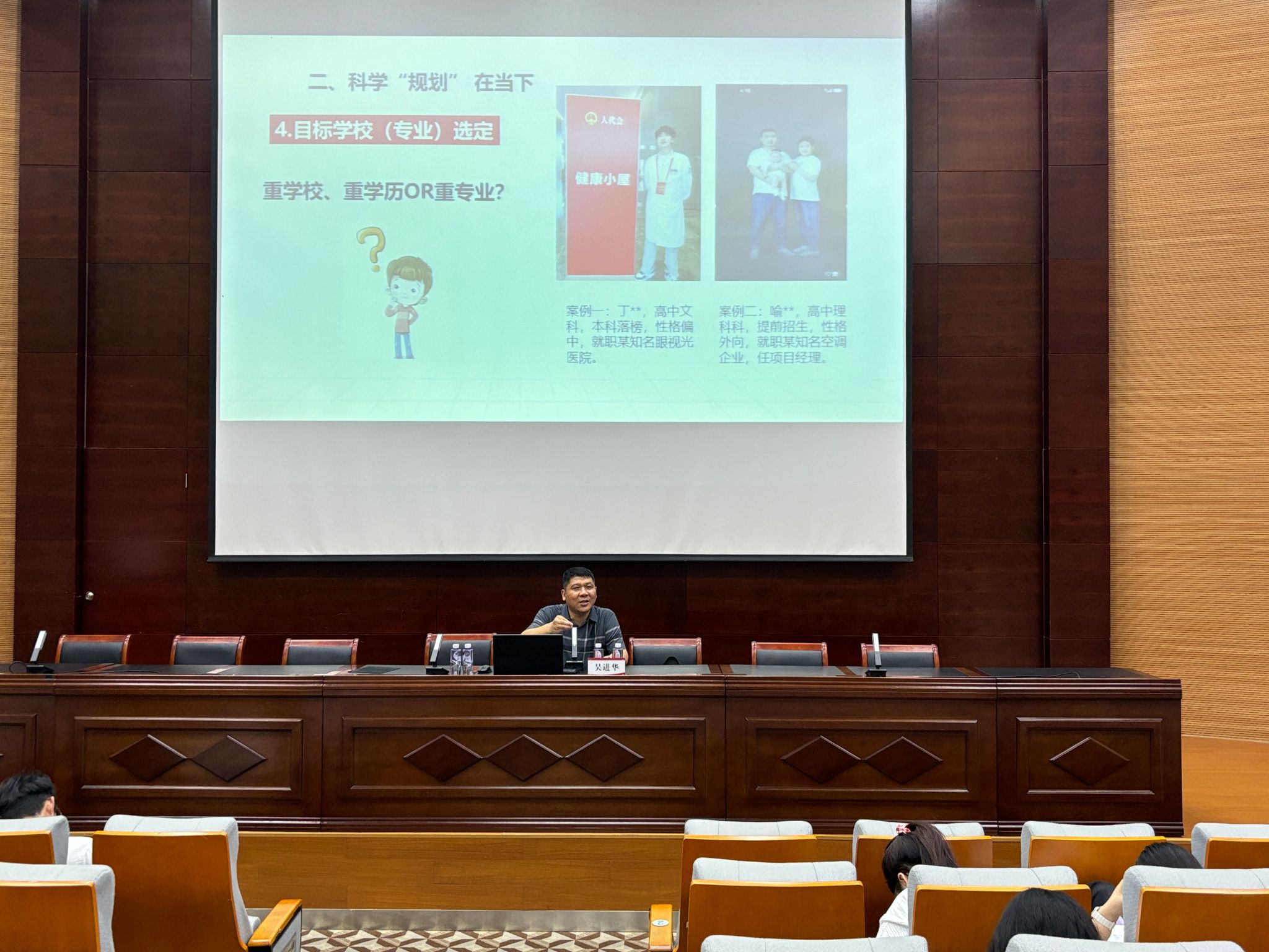吳進華憑借多年的生涯發展教育和就業育人體系研究經驗,通過遺憾復盤-科學規劃-未來預演的創新模式,先是用逆向思維喚醒學生成長,用真實案例解析學生過去缺乏學習效率、學習興趣和學習動力的原因;然后,鼓勵同學們科學規劃當下,盡快確定職業目標,明確任職要求,積極進行人職匹配;最后,督促同學們樹立持續精進的職業理念,勇于奮斗拼搏,讓職業變得可觸可感。在交流環節,他還針對同學們提出的職業規劃相關問題進行了詳細解答,互動現場氣氛熱烈,思想碰撞火花頻現。參會學生紛紛表示,講座內容貼近實際、案例鮮活,不僅明晰了職業規劃的方法論,更汲取了勇于突破舒適區的力量,對未來職業發展充滿信心。