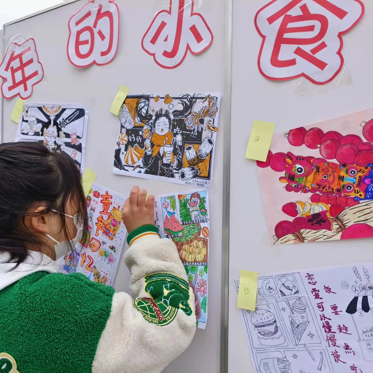 活動主要包括“我想對你說”、“春日來信”以及“童年的小‘食’光”海報評比三個部分。同學們認真閱讀欣賞現場的信件、明信片和海報,透過一幅幅作品感知作者的情緒,并用一張張愛心便利貼、明信片以及小星星貼紙為這些作者送上真摯的祝福,表達對作品的喜歡,同時自己也收獲了滿滿的溫暖。活動現場還支起了“售賣美好”小賣部,同學們紛紛訴說起自己的童年趣事、糗事、樂事,以此來換取童年記憶中的小零食或者小玩具。現場氛圍熱烈而融洽,歡聲笑語不斷。
