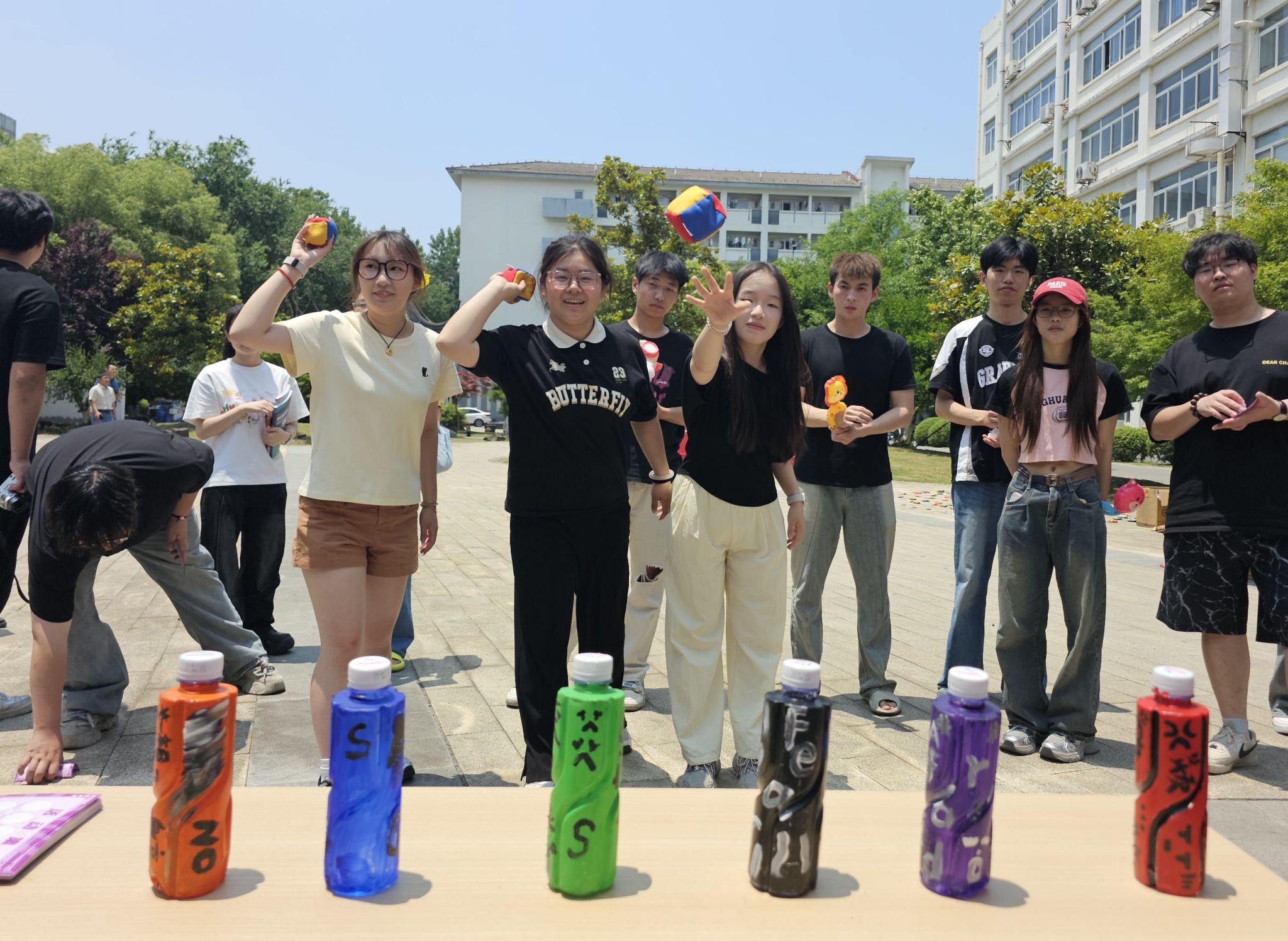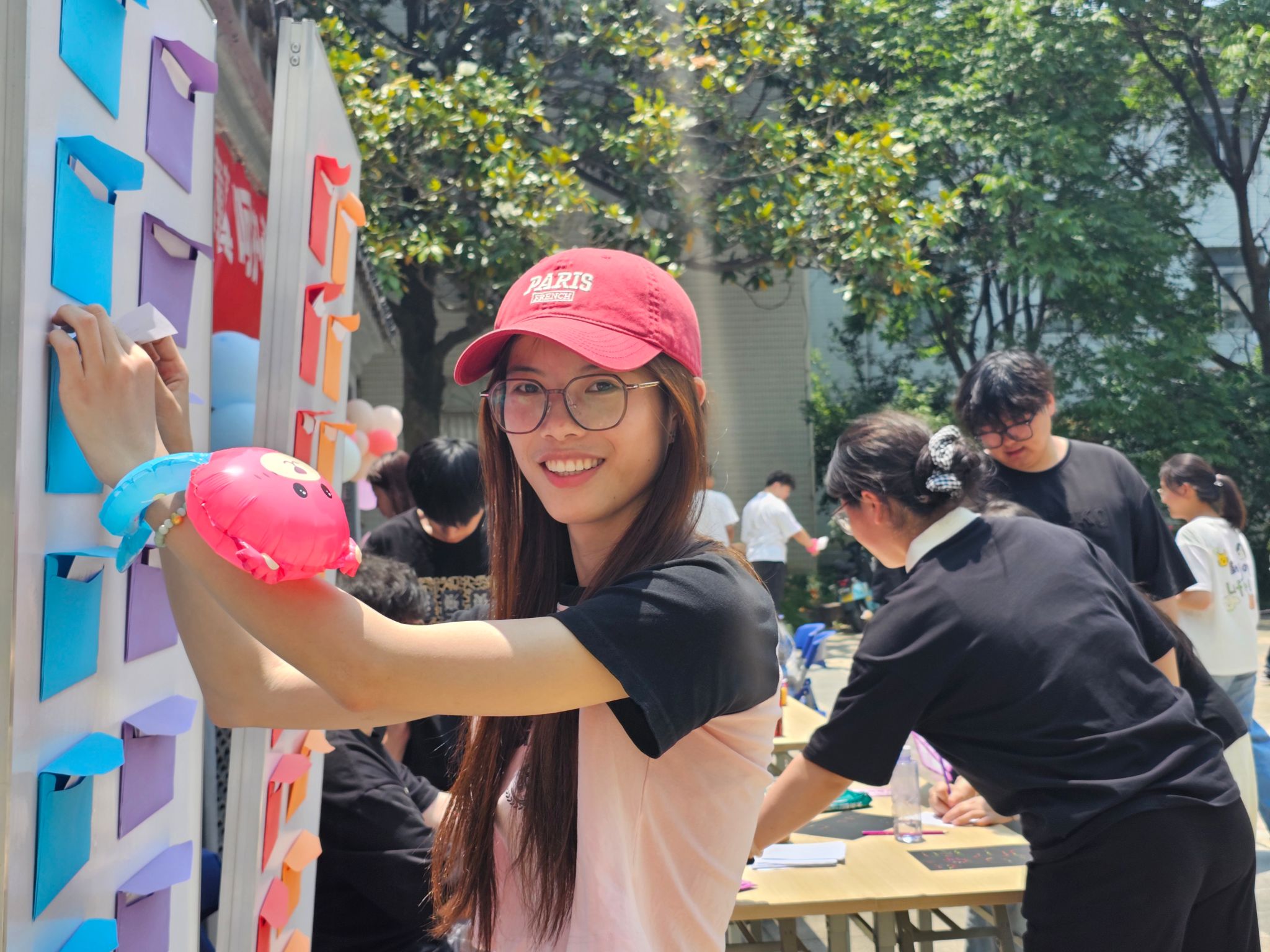 活動現(xiàn)場設(shè)置了多個互動體驗區(qū)。跳皮筋區(qū)洋溢著青春活力,同學(xué)們在皮筋的起落間找回兒時的歡快節(jié)奏;丟沙包區(qū)成為情緒釋放的窗口,大家用沙包擊倒寫有“煩惱”“壓力”的水瓶,在暢快游戲中甩開負(fù)面情緒。套圈區(qū)則充滿驚喜,同學(xué)們瞄準(zhǔn)目標(biāo)拋出圓環(huán),收獲獎品的同時也找回童年的成就感。在“從前慢”書寫板前,許多同學(xué)寫下對親友、未來的寄語,或為陌生人的心事送上暖心回信,傳遞善意與鼓勵。活動吸引了不少老師參與其中,氣氛歡樂而熱烈。