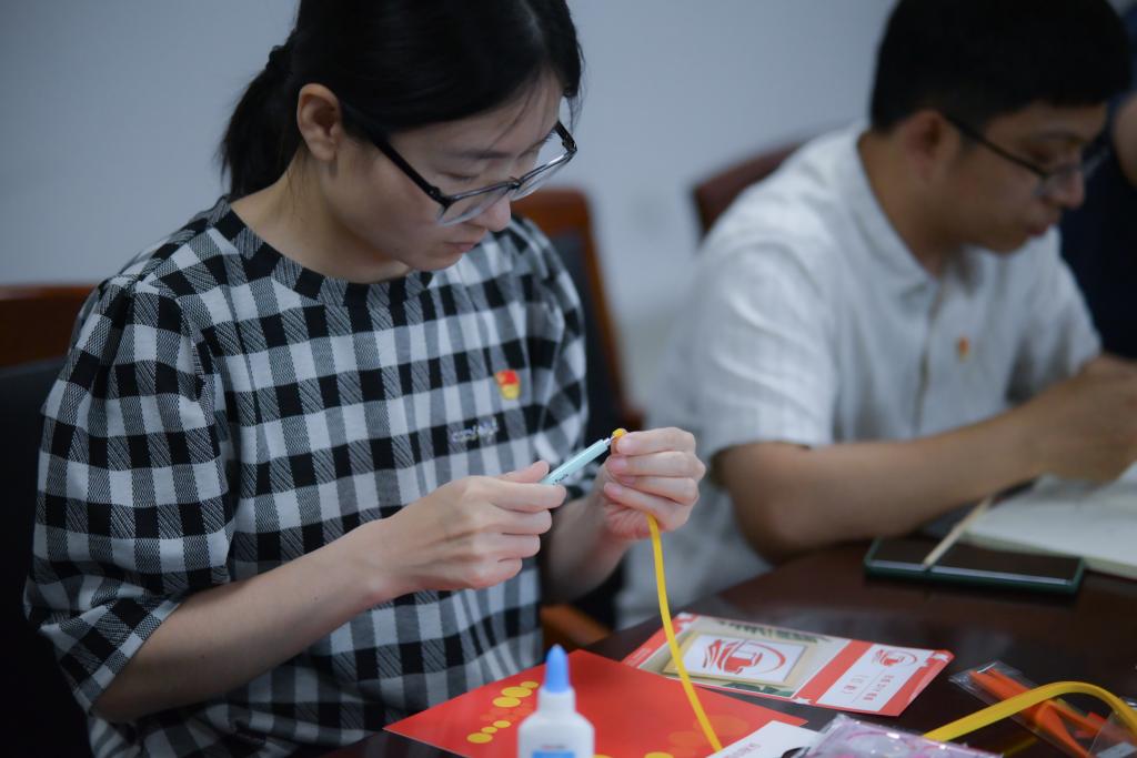 衍紙雖小,但作為文化載體源遠流長。活動中,大家妙手生花,一纏一繞,一粘一貼,將一條條鮮艷的紙帶變成漂亮的紙卷,將大小不一、錯落有致的紙卷拼貼組合,制作成國旗、黨徽、紅船、愛心等圖案,用藝術再創造、再加工的方式,把對中國共產黨崇高敬意賦予指尖,把對黨的無限熱愛和對國家的深深祝福,融入到親手制作的作品里。