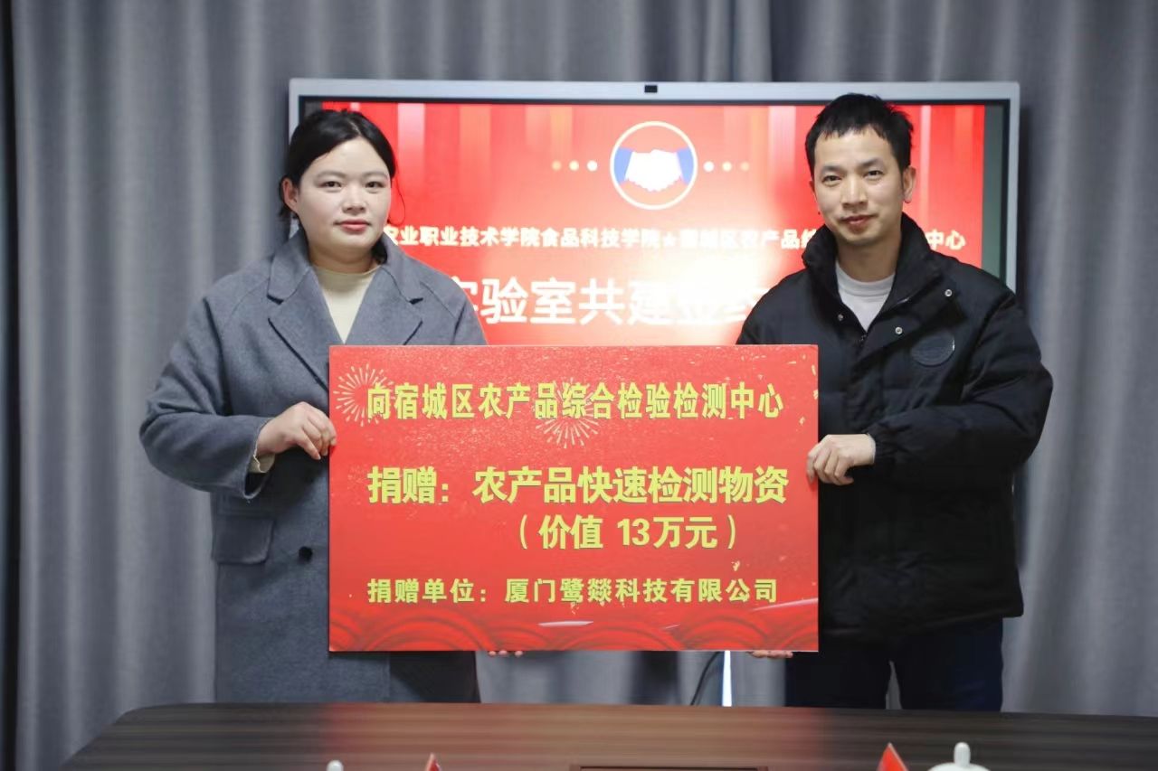 楊廣軍局長致辭,向出席儀式的來賓表示熱烈歡迎,簡要介紹了宿城區“三農”工作,特別是農產品質量安全工作的基本情況,充分肯定了我校掛職干部吳晨奇同志的工作成效。孫維芝書記講話,向宿城區農業農村局、宿城區農產品綜合檢驗檢測中心對我校辦學的關心支持表示衷心感謝,簡要介紹了我校及食品科技學院的基本情況,對實驗室共建工作提出指導意見。高岳副院長結合PPT詳細介紹了食品科技學院農產品/食品質量安全相關教科研情況。李薩利委員和解鵬院長共同簽署《實驗室共建協議》,明確了雙方在資源共享、人才交流、社會服務等領域的具體合作事項。經我校食品科技學院聯系協調的廈門鷺燚科技有限公司沈亮副總經理,向宿城區農檢中心捐贈價值13萬元的農產品快速檢測物資。儀式結束后,我校人員實地參觀了集南社區青年公寓、標準化廠房在建現場、田洼智慧農業產業園等地。