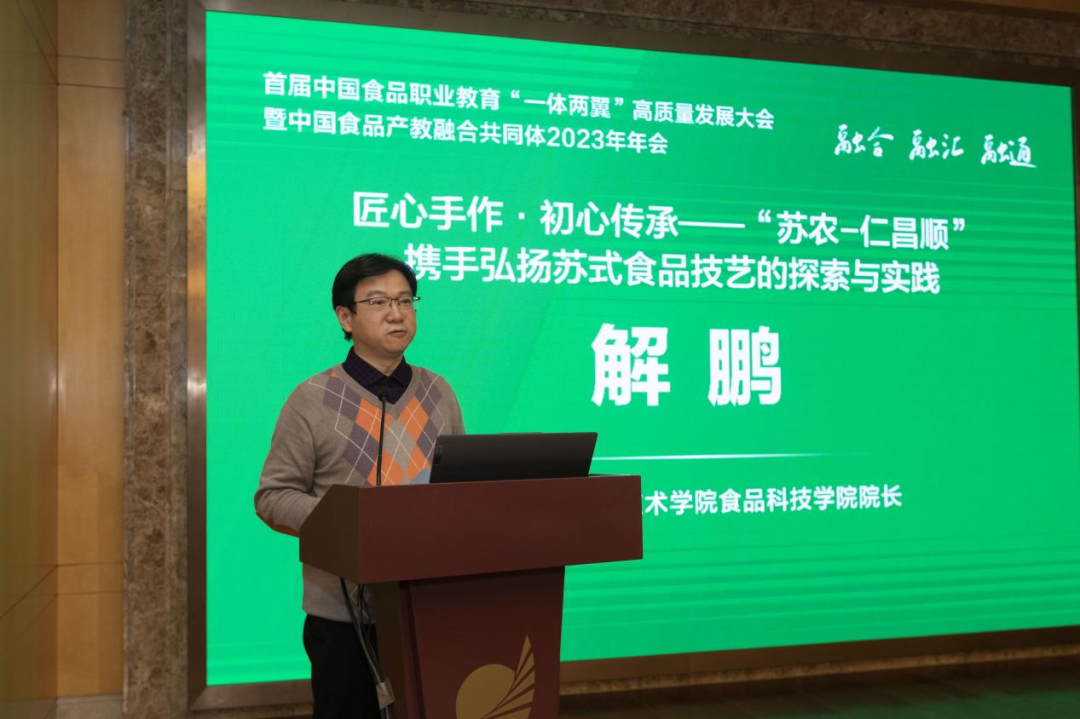本次大會以“融合 融匯 融通”為主題,圍繞全國食品行業產教深度融合、校企協同育人、行業協同創新等內容開展交流與探討。大會現場還發布了《新時代強國建設全國食品行業職業教育創新發展典型案例》,我校食品科技學院的案例《匠心手作·初心傳承——“蘇農—仁昌順”攜手弘揚蘇式食品技藝的探索與實踐》,入選年度“新時代強國建設全國食品行業職業教育創新發展典型案例”。根據大會安排,我校食品科技學院院長解鵬研究員作案例交流發言。