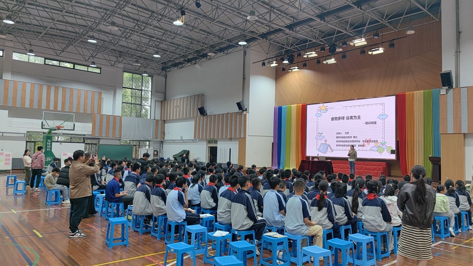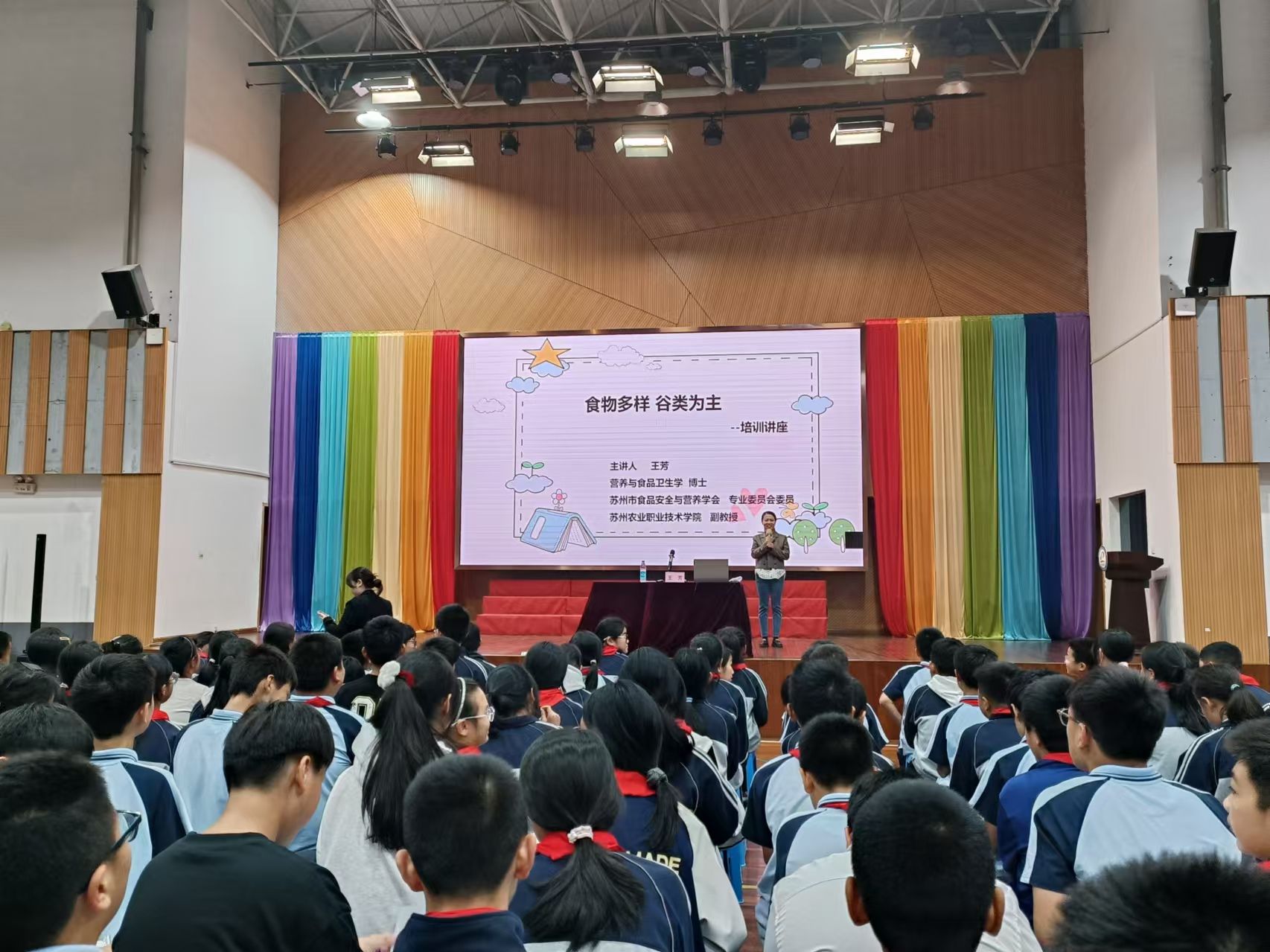 為認(rèn)真貫徹落實(shí)《“健康中國(guó)2030”規(guī)劃綱要》,提高學(xué)生營(yíng)養(yǎng)素養(yǎng),豐富校園文化生活,2024年10月28日下午,應(yīng)蘇州市第十二中學(xué)校邀請(qǐng),我校食品科技學(xué)院選派專家赴蘇州市第十二中學(xué)校舉辦校園營(yíng)養(yǎng)素養(yǎng)專題培訓(xùn)講座。本次培訓(xùn)講座由食品科技學(xué)院專業(yè)負(fù)責(zé)人、副教授王芳博士主講,培訓(xùn)主題為“食物多樣,谷類為主”。