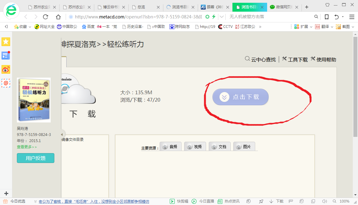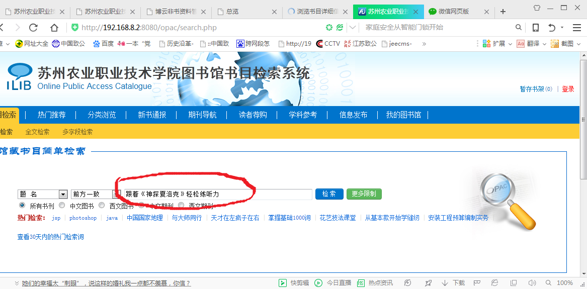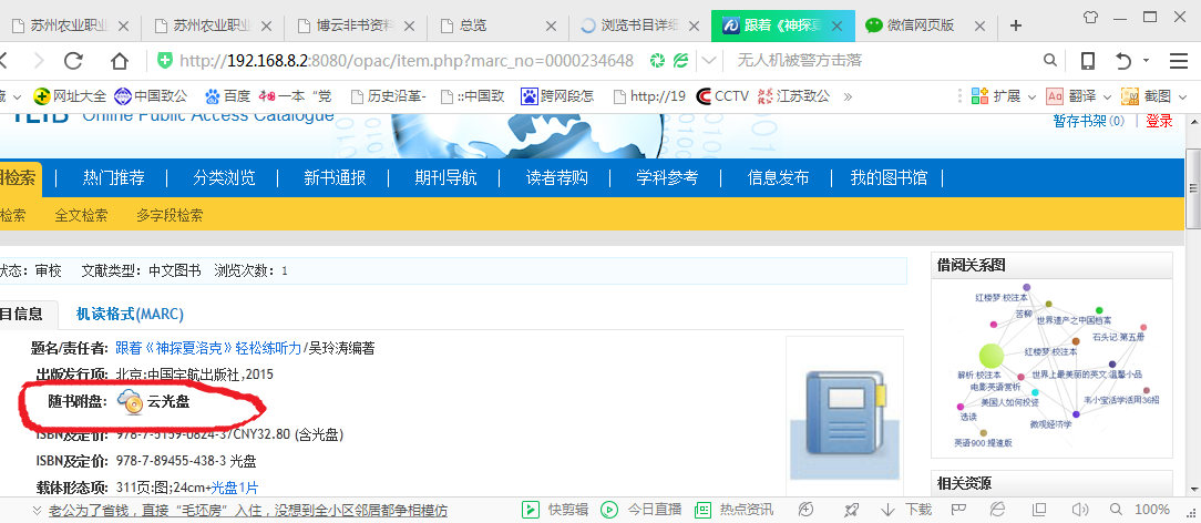 如果您所借圖書含有光盤,而您又想借閱的話,請首先訪問http://192.168.8.2:8080/opac/search.php,在搜索欄輸入圖書信息,比如題名等,點擊“檢索”,找到圖書打開,查看“機讀格式”下文信息,找到“隨書附盤”,打開“云光盤”,點擊下載即可。