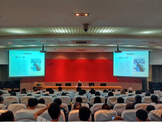 潘書記首先從江南園林的區域、特點和文化等多個方面,向廣大師生解讀了江南園林的深厚文化和藝術價值以及與蘇州園林相關的建筑、植物、賞石、美學、文學等多個領域。又談及古城蘇州現今的文化看點,分別介紹了山塘街、平江路、桃花塢等文化特色,最后潘書記以圖片的形式,展示了古城蘇州、洋蘇州和新蘇州,簡要介紹了園林蘇州的文化定位和城市精神。讓同學們深深了解了蘇州的歷史脈絡,認識到蘇州的人文歷史與園林文化。