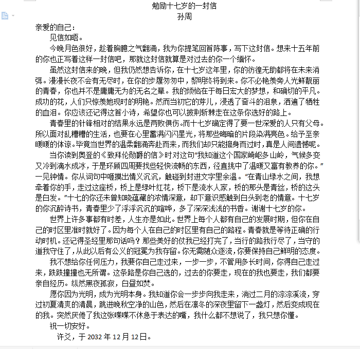 經過評審委員會評審,組委會審核,孫周的《勉勵十七歲的一封信》獲得征文比賽特等獎,李靖智的《我的青春我的夢》和孫心茹的《我的青春我的夢》2篇作品獲得征文比賽一等獎,5篇作品獲得征文比賽二等獎,10篇作品獲得征文比賽三等獎;沈佳寧的作品獲得攝影比賽特等獎,顧家淼、陳欣星2位同學作品獲得攝影比賽一等獎,5位同學獲得攝影比賽二等獎,10位同學獲得攝影比賽三等獎(獲獎名單見附件)。