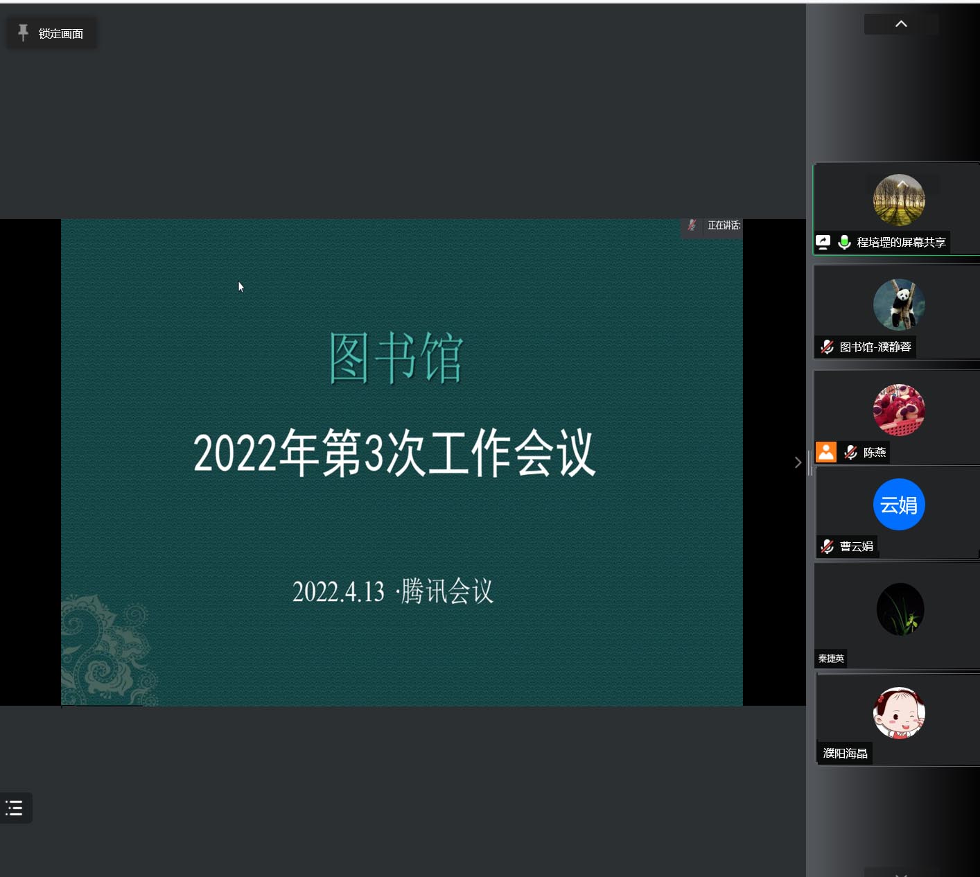 4月13日下午,圖書館以騰訊會議的方式召開了2022年春季學期第3次工作會議,圖書館各部門負責人參會,會議由程館長主持。