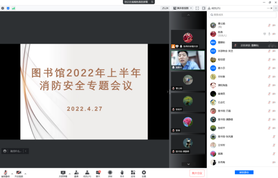 4月27日下午,圖書館和安全保衛處聯合以線上會議方式召開2022年圖書館消防安全專題會議。圖書館程培堽館長、學校安全保衛處童順標專員出席本次會議,全館館員和部分物業工作人員參加會議。會議由圖書館綜合部陳燕部長主持。